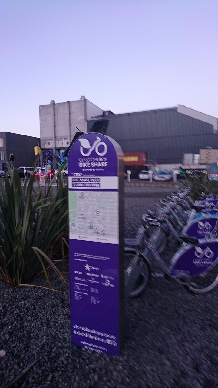 ニュージーランドの南島の大都市クライストチャーチに行った際、泊まった市内中心部のホテルからショッピング街に向かって歩くと、大地震の爪痕が残っており工事個所も目立ったが、30分間は無料のレンタサイクルがありちょっと驚いた。