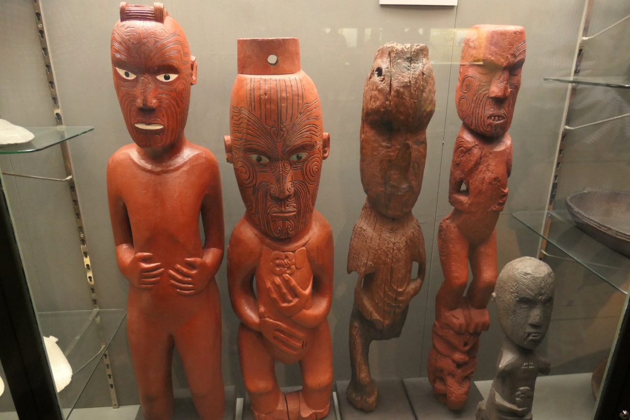 オタゴ博物館はダニーデンの中心部(オクタゴン広場)から1kmほど北にありました。入り口の案内表示には日本語も書かれていました。建物外見は新しくはありませんが、内部は改装されたようで近代的なお洒落なアレンジがされていました。マオリを始め南太平洋の島々の人々の文化・芸術が展示されています。武器や人形、船や家の飾りなど木製の多様な品々が分かり易く展示されていました。