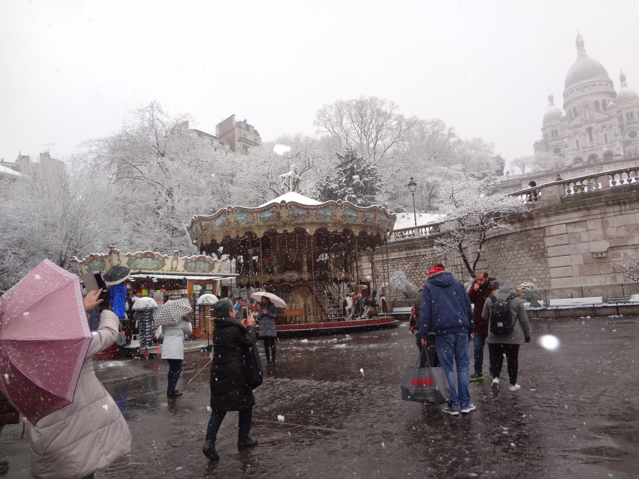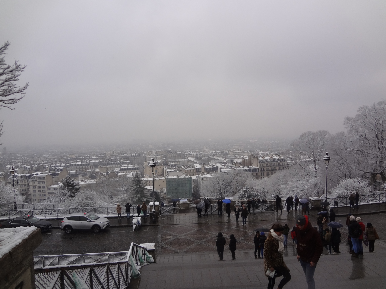 高台にある寺院に行くには坂を徒歩で上るかケーブルカーを利用する必要があります。往きはケーブル、帰りは徒歩がいいと思います。寺院の前からパリ市内を眺望できます。私が行った時はあいにくの空模様(雪)のため、せっかくの眺望を楽しむ事は出来なかったのが残念でした。寺院の中ではミサが行われている事も多いようでした。