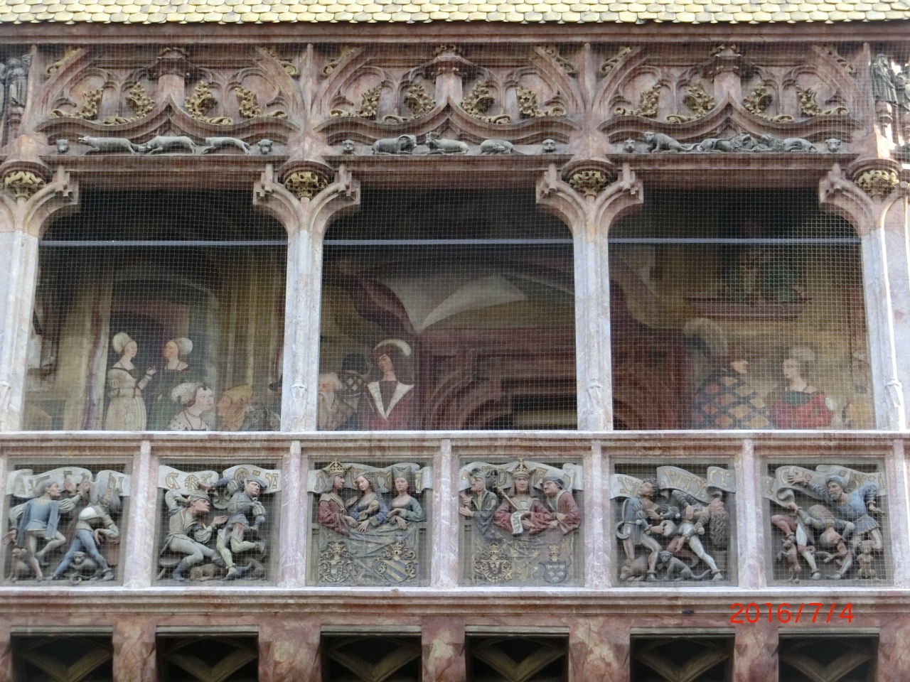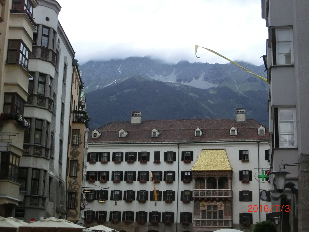 やはり有名なのは街のシンボル「黄金の小屋根」でしょう。今でいえば豪華なキンピカなロイヤルボックスとでも言いましょうか?正面から見れば「取って付けたような」違和感を感じます。跡から追加したのだそうです。この黄金の小屋根の、建物の屋根の遠く向こうにはアルプスがさり気なく見ることが出来ます。