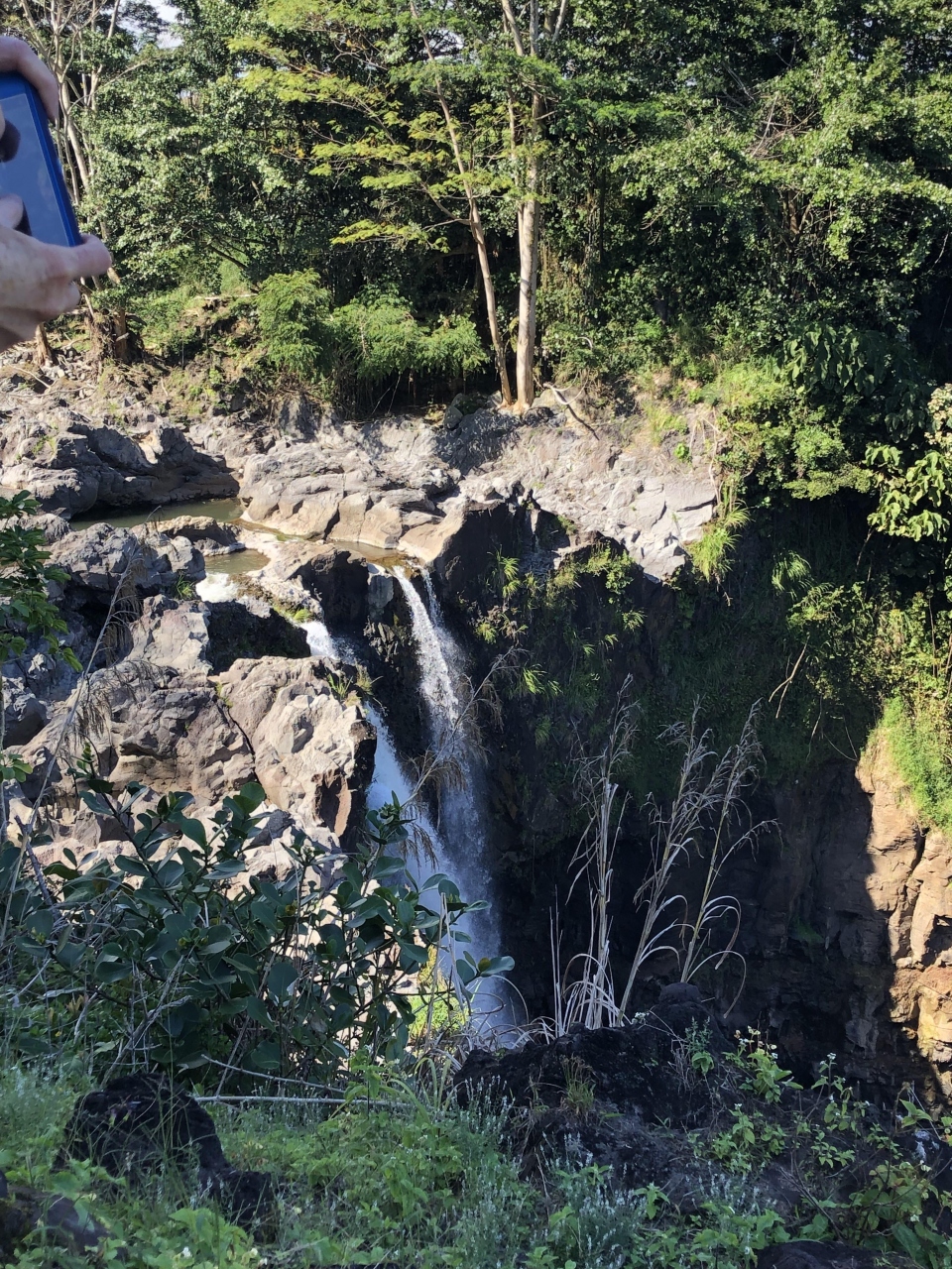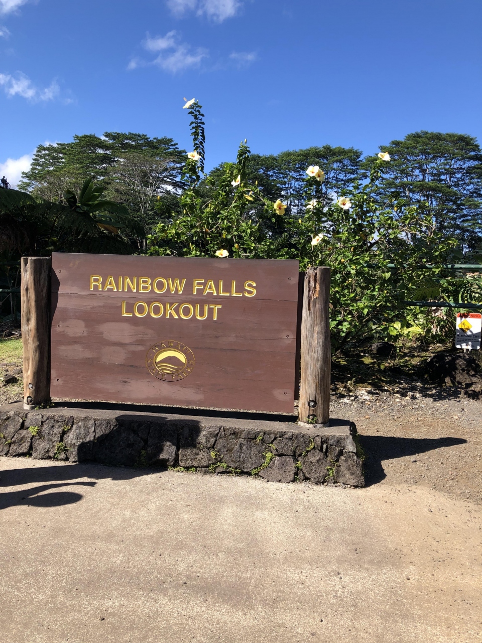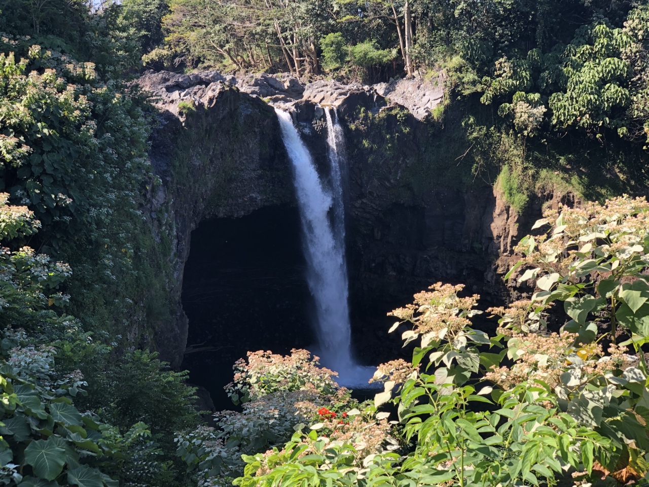 ヒロのすぐ側にあるこの滝は流れ落ちる滝の飛沫に太陽が