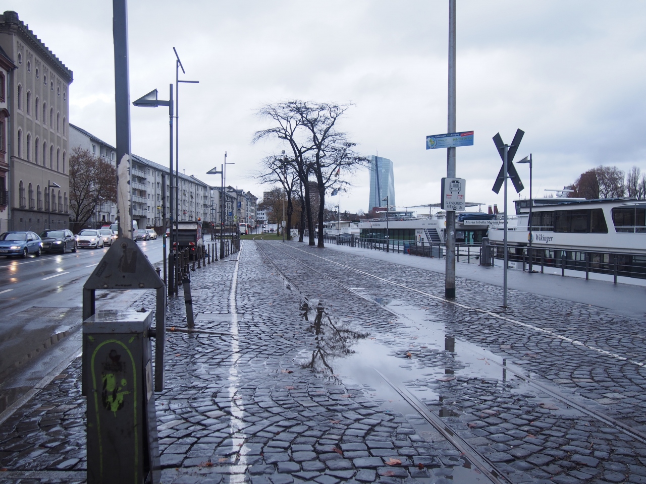 レーマー広場から南に1、2分歩くとマイン川です。そのマイン川沿いの道がマインカイ通りです。車道が走っていますが、幅広い歩道があるので、落ち着いて歩いて行くことができます、またマイン川の流れやマイン川に架かる鉄の橋などもよく眺められます。ただ訪れた時期は1月で昼間も零度前後の気温であったので、川風が吹くこの通りは寒さを強く感じました。