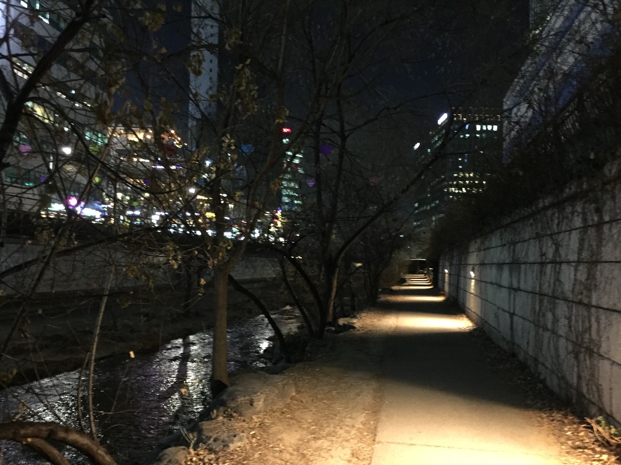 夜に行ったので、寒く、暗い、あまり通行してる人はいませんが遊歩道になってて、美しい風景でした。橋から階段が付いていて、通路に降りていけます。昼間はまた違った景色ではないでしょうか。所々川の端に氷があって、寒いことがよく分かります。