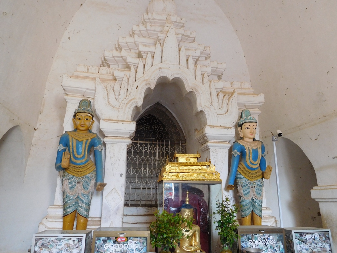 オールドバガンにある寺院です。バガンで最も高い寺院ということで目立っていました。白くて綺麗な寺院でした。白い壁に水色の仏像が映えていました。ミャンマー人の参拝客もいっぱいいて真剣にお祈りされていました。