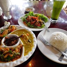 ハンバーガーが名物のレストランですが、エビカレーとミントライムジュースを注文しました。エビカレーには無料のサラダが付いていてサラダメニューから選べたのでトマトサラダにしました。エビカレーは普通の味でしたがトマトサラダとジュースがおいしかったです。無料のデザートのバナナまで付いていて満足しました。