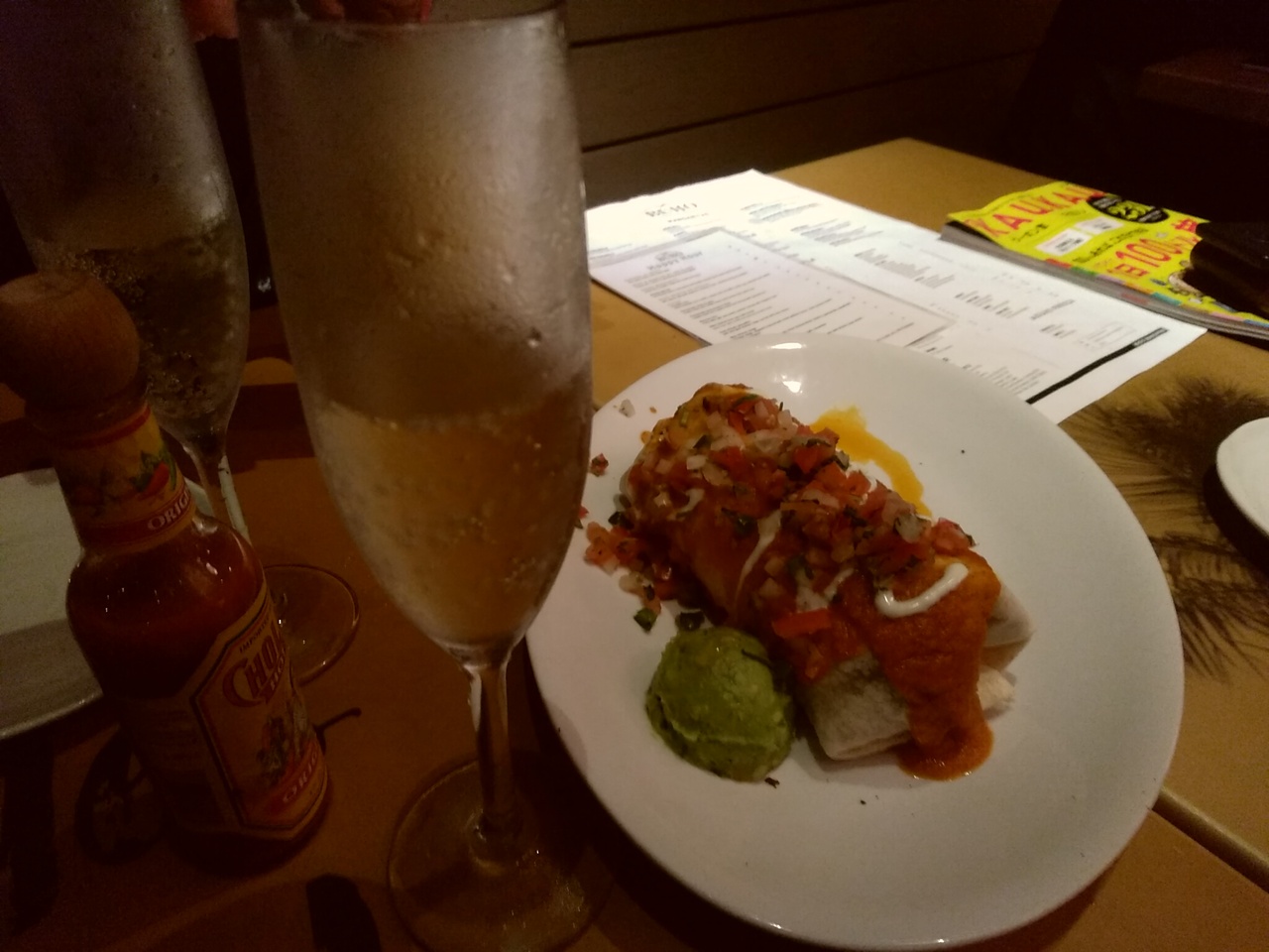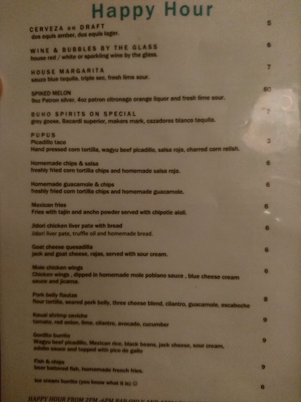 夜10時からはハッピーアワー!!物価の高いハワイでは、これがなきゃあ飲みまくれないですよねー~ 私はシャンパン6ドルを6杯飲みました。フードもハッピーアワー料金の物はいくつかあります。ブリトーだけを注文し、あとはひたすら飲みまくり♪