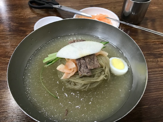 江南駅から歩いて5分ほどのビルの中にある冷麺で有名なお店です。地下鉄の出口は4番出口が最寄りです。ビルの地下1階の奥の方にあるので探すのが大変でした。日曜日のお昼に行ったのですが、そんなに混んでいませんでした。冷麺(12000ウオン=1200円)を注文すると、まずは小さなヤカンに入った牛骨スープと薄切り大根のキムチが出てきました。冷麺のスープは、シャリシャリに凍っていて、寒い冬でにはちょっとという感じでした。薄味のスープでしたが、そこそこ美味しかったです。