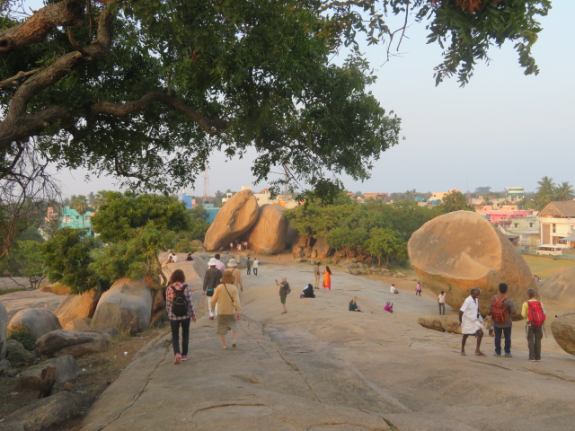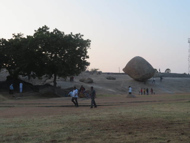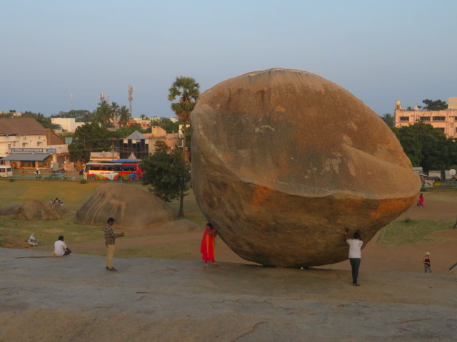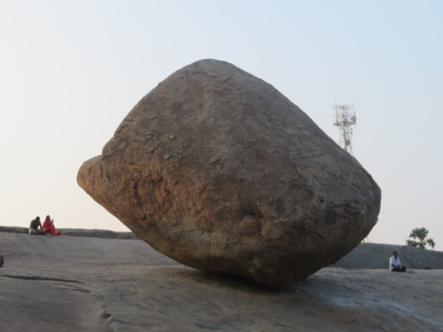 マハーバリプラムのアルジュナの苦行を見た後、すぐそばにあるので行きました、大きな岩で遠くからも見えました、不思議なことに坂の途中に止まっていて転がりそうですが全く動きません、動いたら大変です、皆、岩をバックに写真を撮っていました、斜面を上がって裏側から見るとナイフで切ったようになっていました、近くの岩も見ながら散策しました。