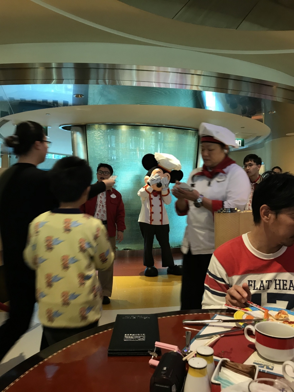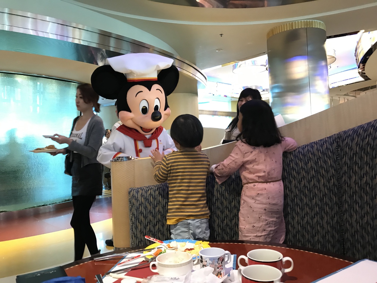 撮るお客さんがいない時もあり、スタッフとじゃれています。そんな一瞬を撮ろうとスマホを構えると、こっちに気づいてポーズとってくれました。更には、静かに私達のテーブルに近づいてきて、後ろからヒョコっと顔だして、チビ達大興奮!昨日よりチビ達も緊張がほぐれてミッキーにからみまくりでした。それを見てひたすら写真撮る私が1番興奮していました。たくさん良い写真が撮れ、大満足なひとときとなりました。