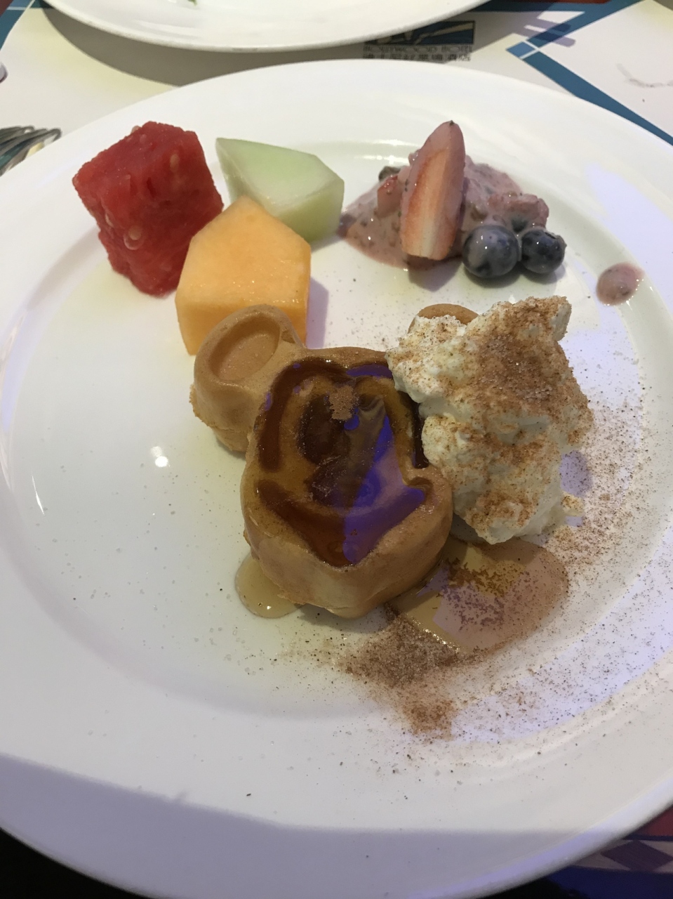 パンコーナーには、シンプルなものから、デニッシュ系までバリエ豊富。エッグタルトもあり、滞在中ここで一度食べただけですが、美味しかったです。プリンタルトみたい。チビのご飯に悩みましたが、基本の白米と味噌汁が1番食べたかも。娘は食後にミッキーのパンケーキ?ワッフル食べて幸せそうでした。