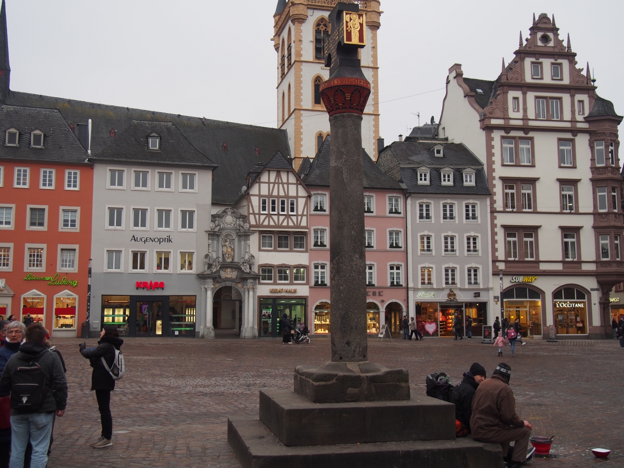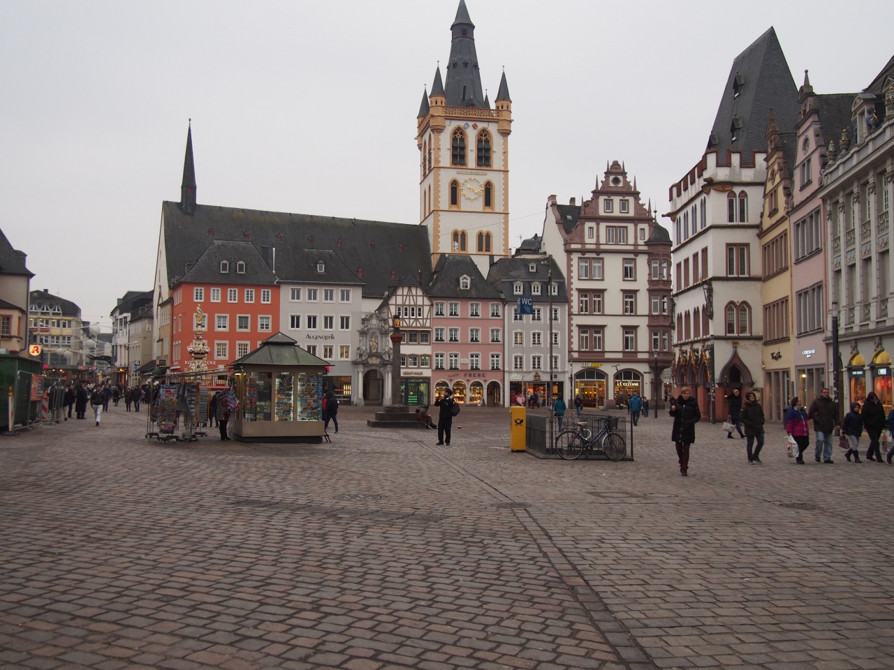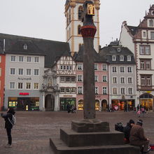 トリア―の旧市街の中心となる場所が中央広場です。ポルタ二グラから歩いて2、3分です。広場に面して東側には大聖堂、聖母教会もあります。また聖ガンゴルフ教会の尖塔が見えます。広場には木骨組の歴史を感じる家並みが続き写真を撮りたくなるような景観が続きます。