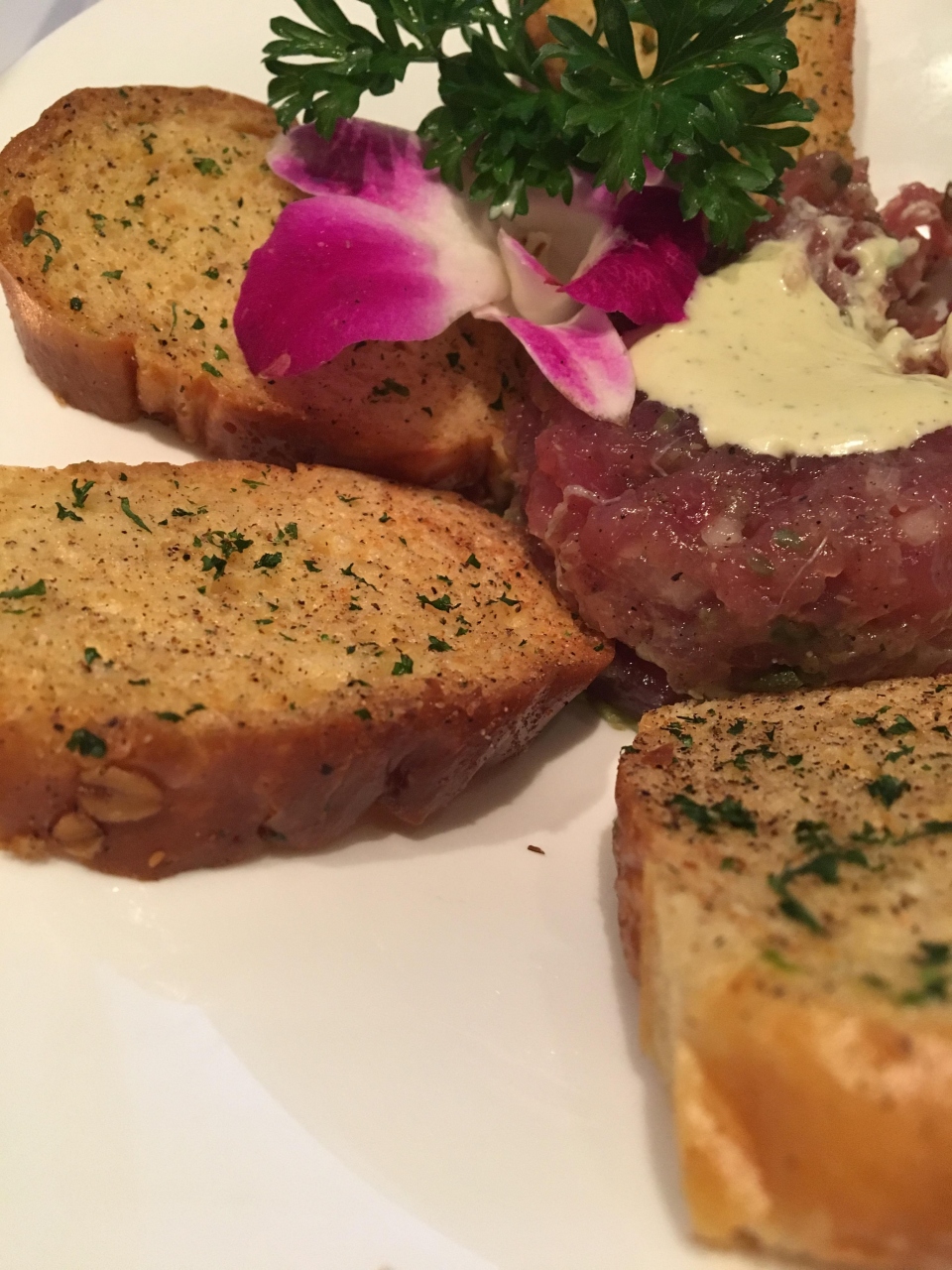 おすすめのレストランです。こちらはアラモアナホテルの最上階にあります。ディナータイムは夕陽もきれいに見えるため、結構混んでいると思います。確実に入るにはご予約をお勧めします。サラダ、ステーキ、マグロのタルタルを頂き、お腹いっぱいになりました。