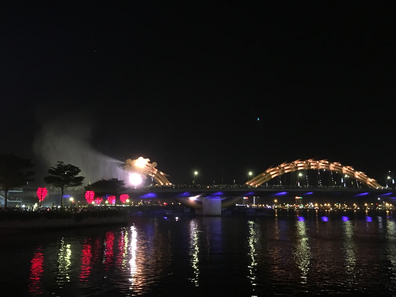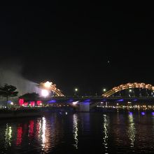 土日には、午後9時から、火と水を噴くショ一があります。時間になると橋を通行する車がストップされるので、すぐにわかります。まず火を噴いて、しばらく置いて、今度は水を吹きました。それが二回、10分ぐらいでした。すごい人出なので、早めに行った方がいいです。