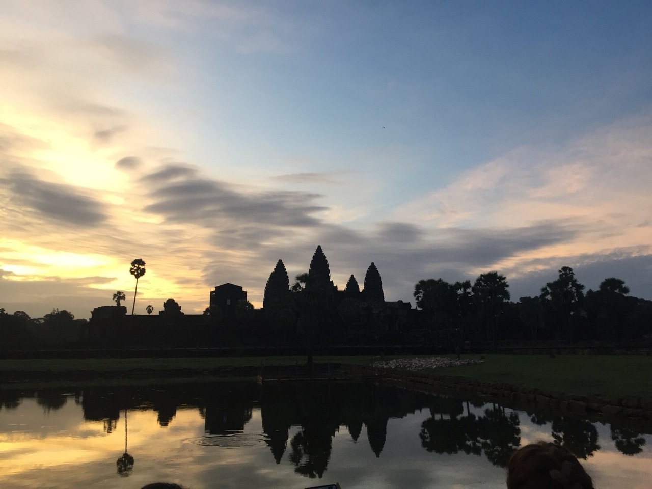 朝日の時間と夕方の2回行きました。朝日の時間は夜明け前でまだ暗いうちにもかかわらずたくさんの人がいて、池に写るアンコールワットをきれいに撮るためによい場所をとりたいのであればかなり早く行く必要があります。