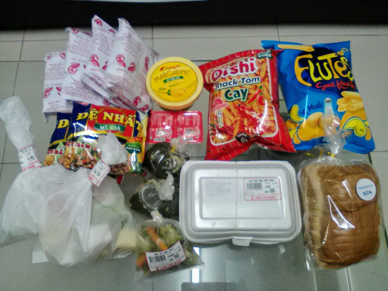 テト(ベトナム旧正月)前に行くと超激混みです。皆さん年の瀬の買い物なのでしょう。日本も同じですよね。元日と2日は休業するのでそのせいもあるかもしれません。私も買いだめしときました。インスタントラーメン6個、スナック菓子2個、マーガリン、練乳、ライス、おかず、パン1斤、量り売りのお菓子を買っても(写真参照)10万ドンに届かず…。日本円ではなんと500円以下。ベトナムは日本はもちろん周辺国よりも物価が安く、お値打ちなスーパーマーケットだとさらに物価の安さを実感できます。