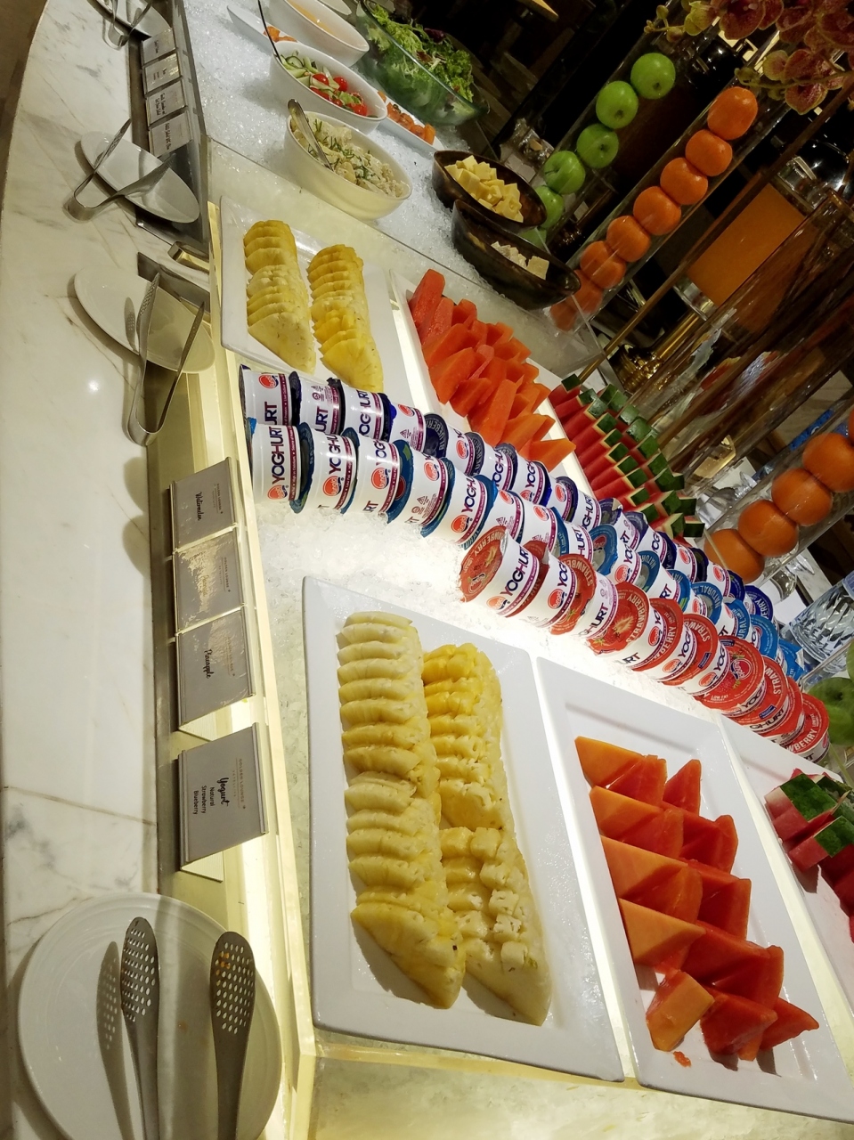 ナシレマやフルーツ類、ヨーグルト、サラダ、スクランブルエッグ、焼売ありました。