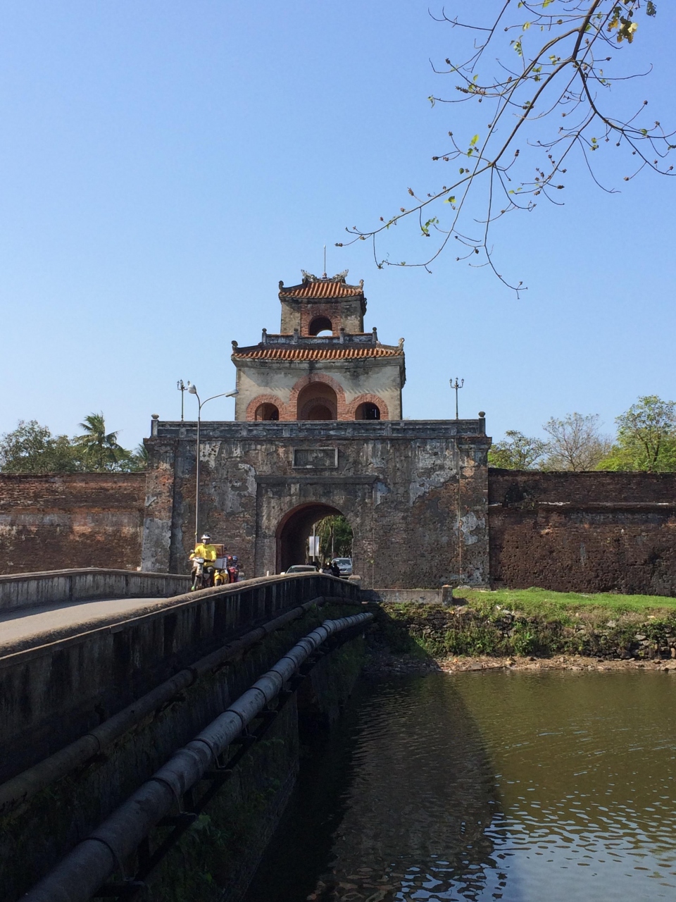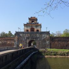 新市街地からチャンティエン橋を渡り、大通りを左折するとすぐに、右手に見えました。古い城壁と砲弾の跡が残る歴史を感じさせる建物です。王宮からフォン川に向かって一方通行で、人、車、バイクが混然と通っています。王宮に入るにはガン門から入るのがお勧めです。チャンフンダオ通りに向かって、入り易そうなレストランが2.3軒ありました。