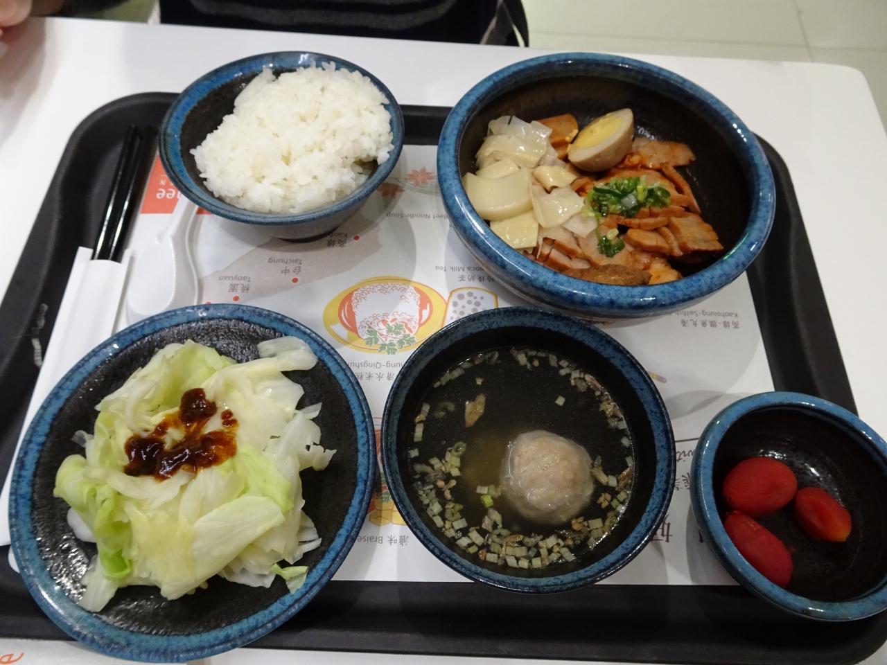桃園空港第2ターミナルD乗り場にあるレストラン。名前は忘れましたが、お店お勧めのラーメンは濃厚なスープはエビで出汁をとっているような味わいで、鶏モモが1個乗っています。麺は、こんにゃくのようでヘルシーでした。妻は豚肉の定食で、豚肉とタケノコの炒めと団子のお汁と野菜。普通に美味しかったです。カタオカミルクティも日本よりは安く飲めましたよ。