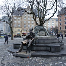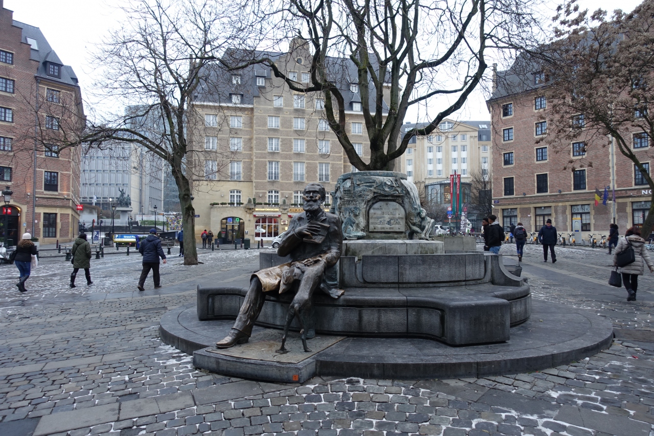 ブリュッセル市街中心部、ノボテルホテルのすぐ前の広場にあります。噴水のふちには腰を掛けた男性の像、さらには男性になついている犬の姿がありました。残念ながら噴水に水は流れておらず、寒々とした雰囲気のみが感じられました。なかなかユニークな像です。