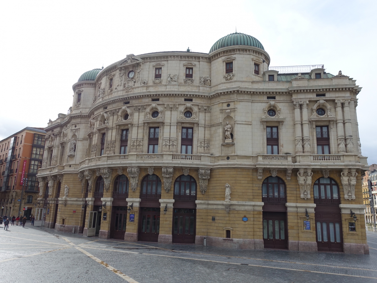 グッゲンハイム美術館を見学した後、市街を散策中、ビルバオ川を渡って旧市街に入ってすぐの場所にありました。ヨーロッパならではのクラシカルで威風堂々とした建造物で、様々な角度から見ると、異なる建物のように感じました。軽く円を描いたファサードが特に印象的でした。