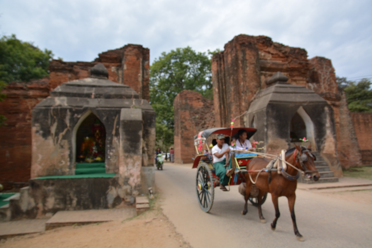 ニャンウーのゲストハウスからレンタルバイクでオールドバガン方面へ向かいました。かつての城壁の名残です。人や車の往来は激しいです。門の両側には左右それぞれのくぼみの中にバガンの守護神の像を見ることができます。
