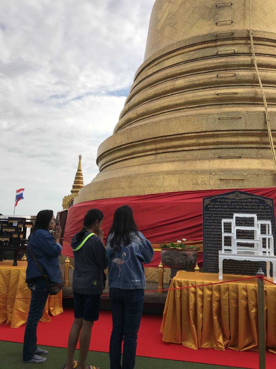 お寺も素晴らしいのですがそこから見るバンコクの景色が素晴らしいです。頂上はいるとなんだかすごく癒されます。鐘の音が日本のものとちょっと違って楽しいです。黄金の丘という名前にふさわしく、美しく、ずっといたいなと思う、降りたく無いなと思う場所です。