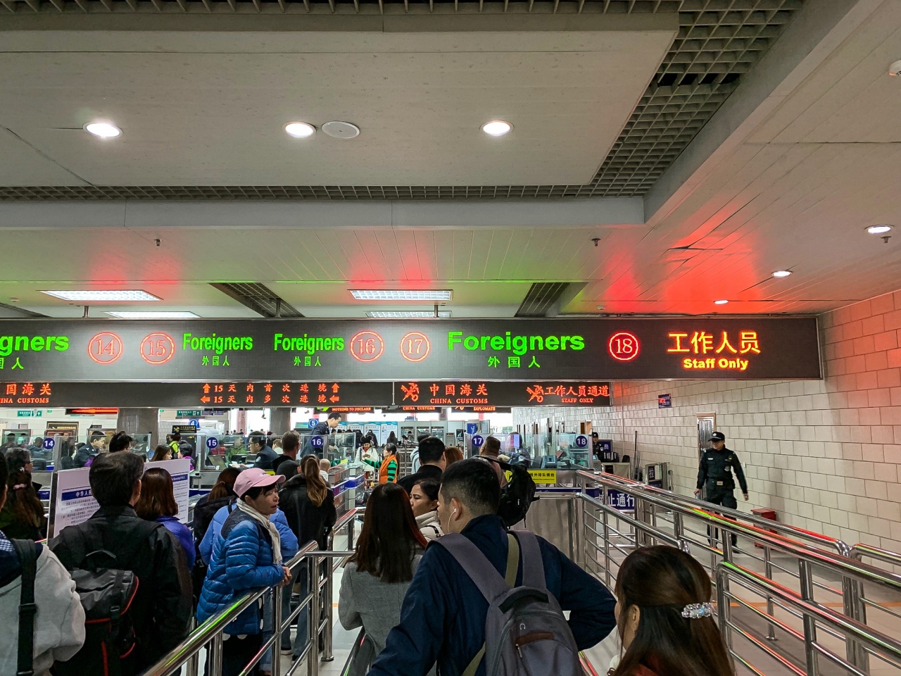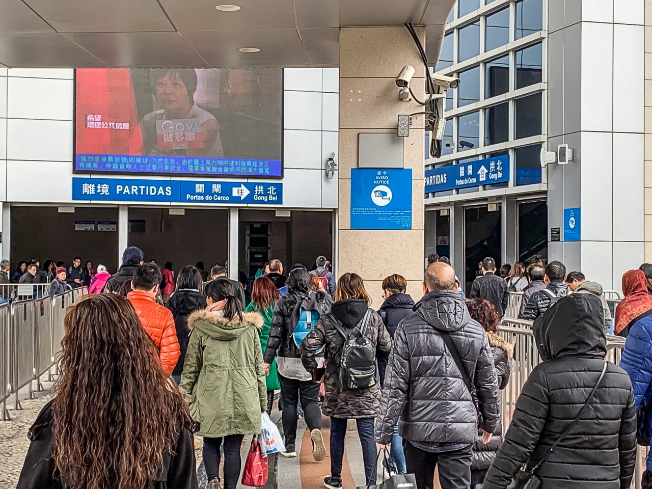 マカオから中国の珠海へ抜ける場合は、まずマカオを出る手続きをして、その後に珠海に入る手続きをします。離境と書いてあるところから建物内に入ります。人の波に従って進んでいくと迷うこともあり、簡単に出国、そして入国が出来ます。