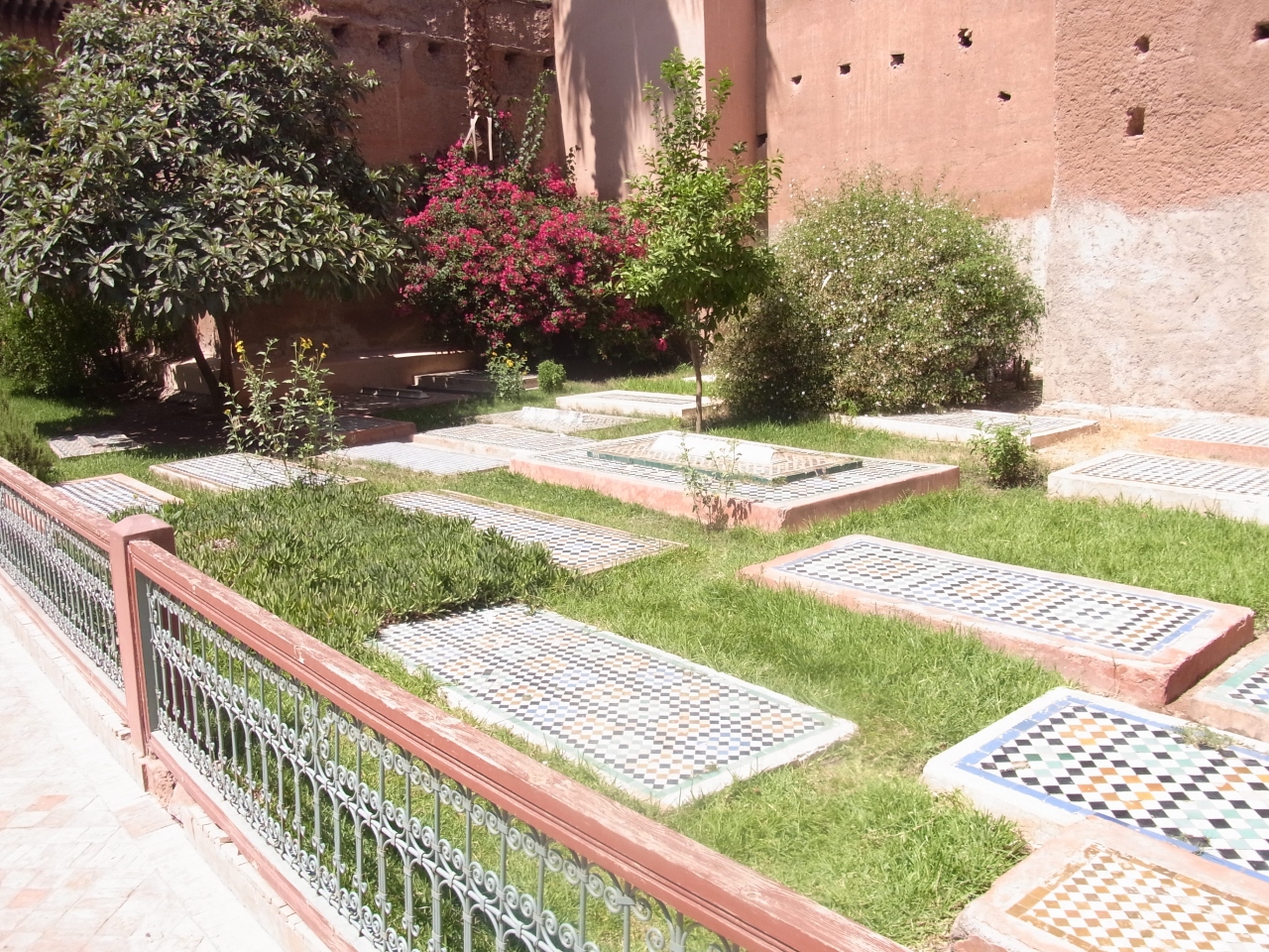 フナ市場を拠点にして南へ旧市街を散策。サアード朝の墳墓郡にたどり着きました。ところどころ垣間見えるアラブ超の様式やモロッコ独特の色使いが相まって独特の世界感に浸ることができます。周りはまるで迷路のようです。