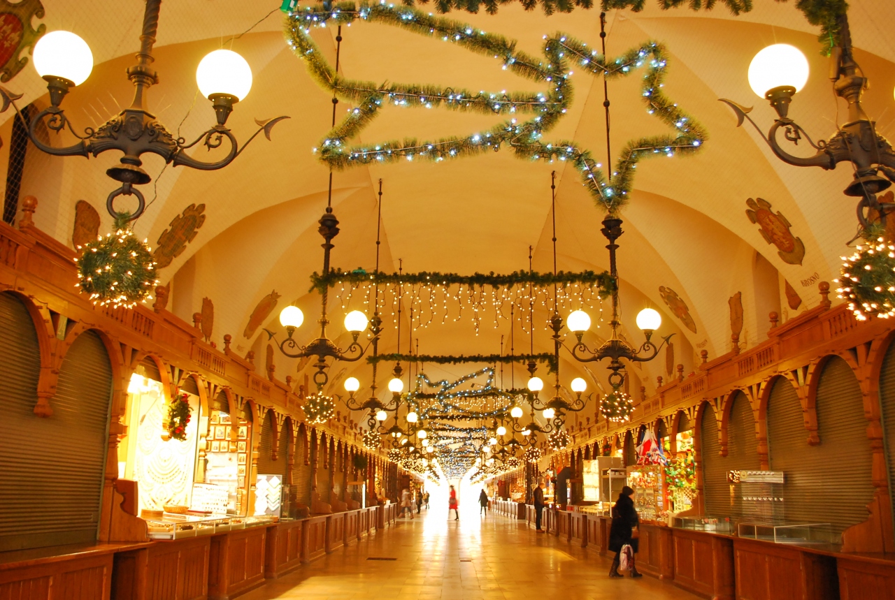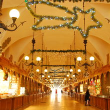 横に長い織物会館の1階は、横に長い一本の通路があり その両側にはお土産やポーランドの民芸品小さなお店がたくさんあります