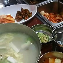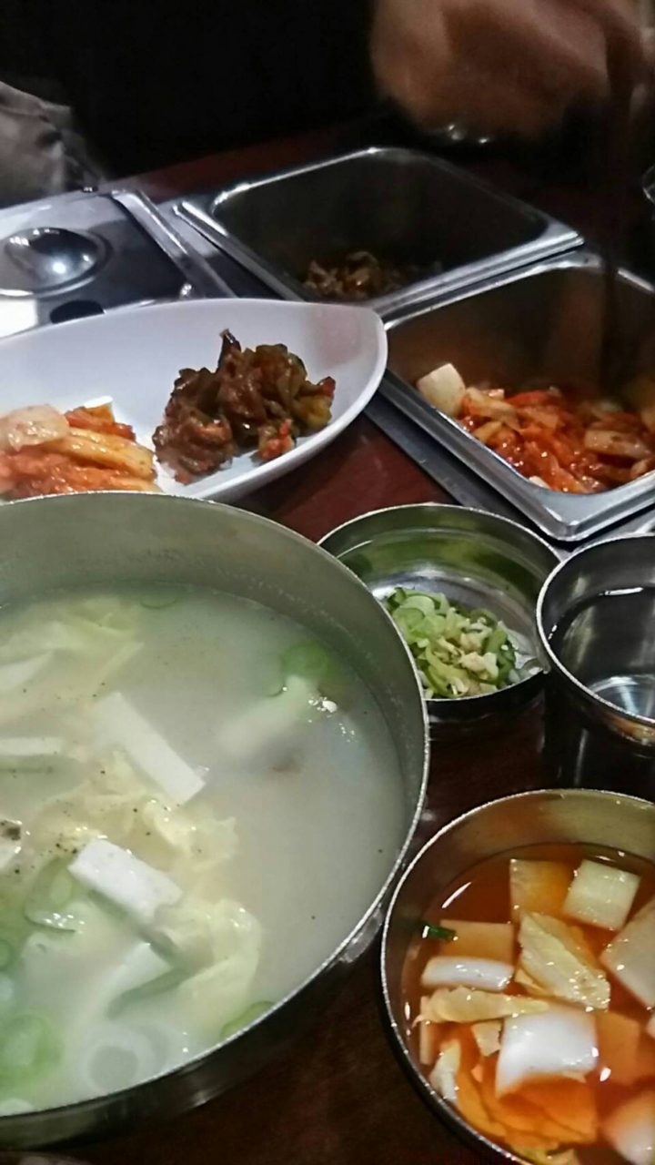 お好みでキムチやニラを加え、味の変化を楽しめます。きゅうりのキムチと漬けが美味しかった。1杯7500ウォン