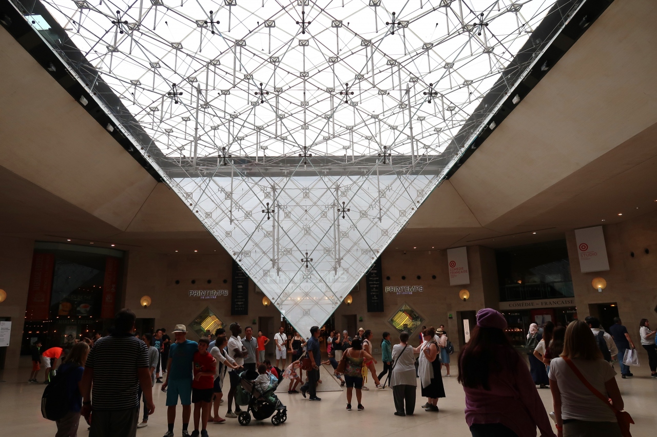 ルーブル美術館入口につながっているショッピングセンターなので、美術館への長い行列に並ぶ場合も、ここなら炎天下や雨が避けられる分、少しは楽だと思い、利用しました。映画「ダ・ヴィンチ・コード」に出てきた逆さピラミッドが見えてきたら、やっと美術館入口です。ここまで到達するのに30分以上かかり、入場する前から疲れました。