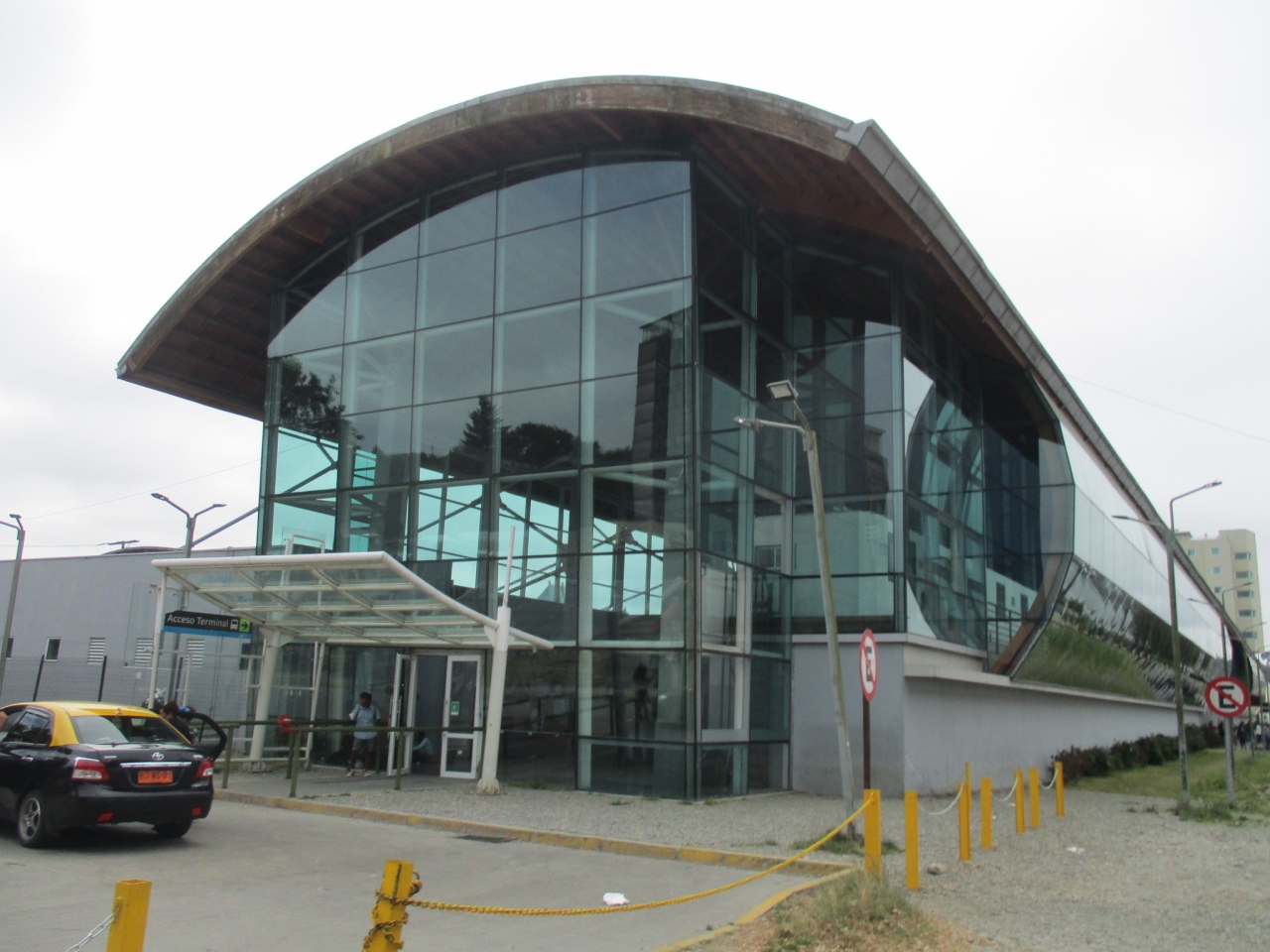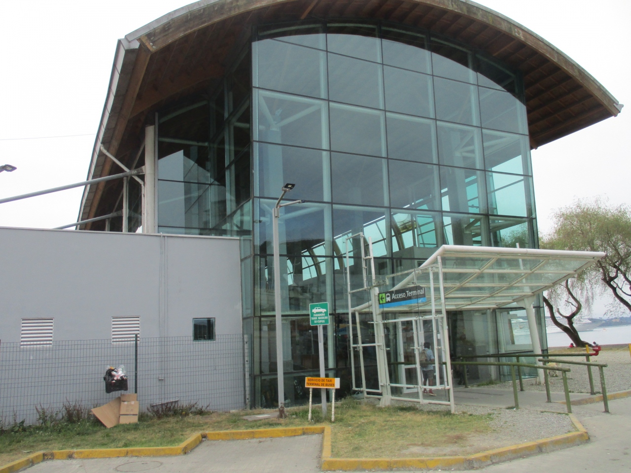 太陽の光に映えるエメラルドグリーン色のレロンカビ湾に面するディエゴ・ボルタレス大通り沿いにある大きなガラス張りのチューブ状に見える建物がバスターミナルでした。