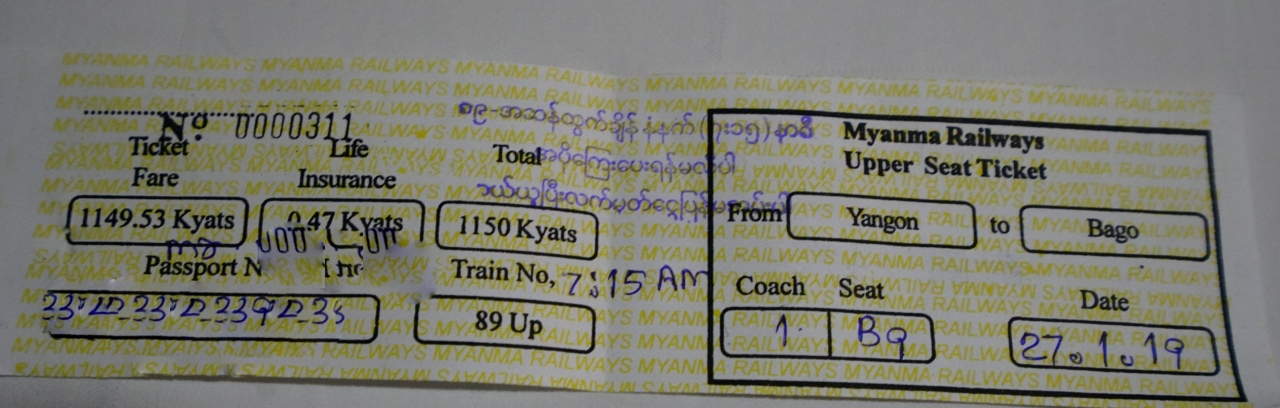 コンピューター無しに手書きの台帳管理で処理しているようで手分けして時間ごとに窓口を分けて管理しているようだ。とにかく7:15発のバゴー行のUpper Classを1150kでゲットできた。なお外国人は購入にパスポートが必要です。(コピーでもOKでした。)