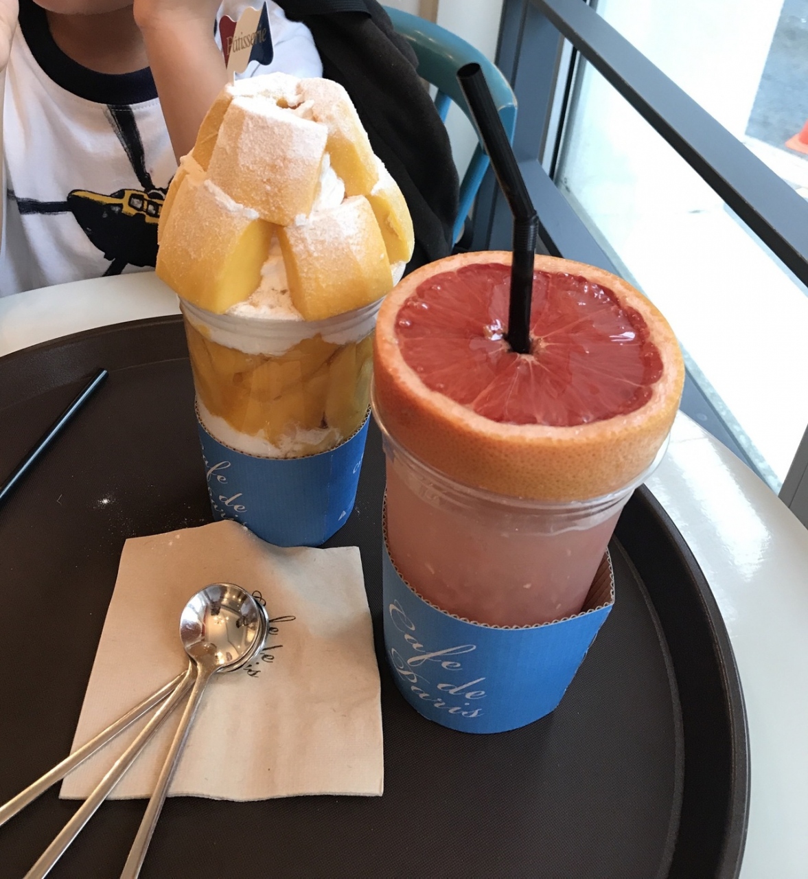 カロスキルに行ったので寄ってみました。お店は全く混んでいなくて、3時頃でしたが待ったりはしませんでした。1人1品注文しないといけないということでしたが、子供がいたので聞いてみると、子供はカウントしなくて大丈夫でした。マンゴーのスムージーとグレープフルーツのジュースを注文しました。どちらもボリュームがすごくて、大人2人と子供とシェアしてちょうどよかったです。見た目とボリューム重視っぽく感じていたのでで味はどうなのかなーと思っていましたが、味もとってもおいしかったです。