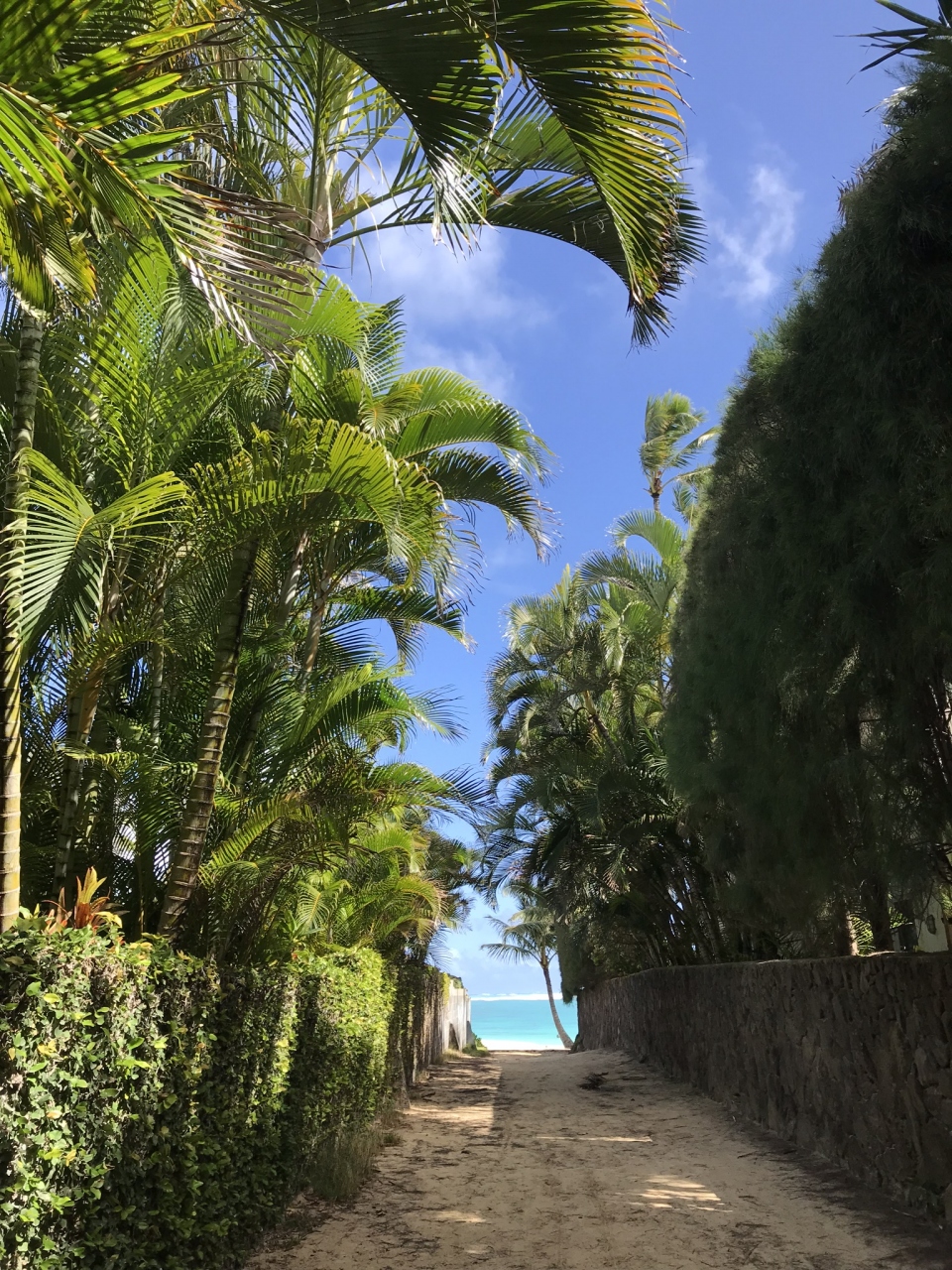 レンタカーがあるとワイキキから40分くらいです。カイルワタウンの中を抜けて海沿いに出ます。そして住宅地の中に秘密の抜け道がありそこからビーチに出ると、それはもう素晴らしいエメラルドグリーンの海が広がっています。でも住宅地の道路は土日は駐車禁止です。平日なら停められるスペースが見つかれば停めて、抜け道からビーチへ行きましょう。ただし、そこはシャワーも何もないので、シャワーやトイレなどの設備があるのは、隣のカイルワビーチに行きましょう。