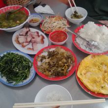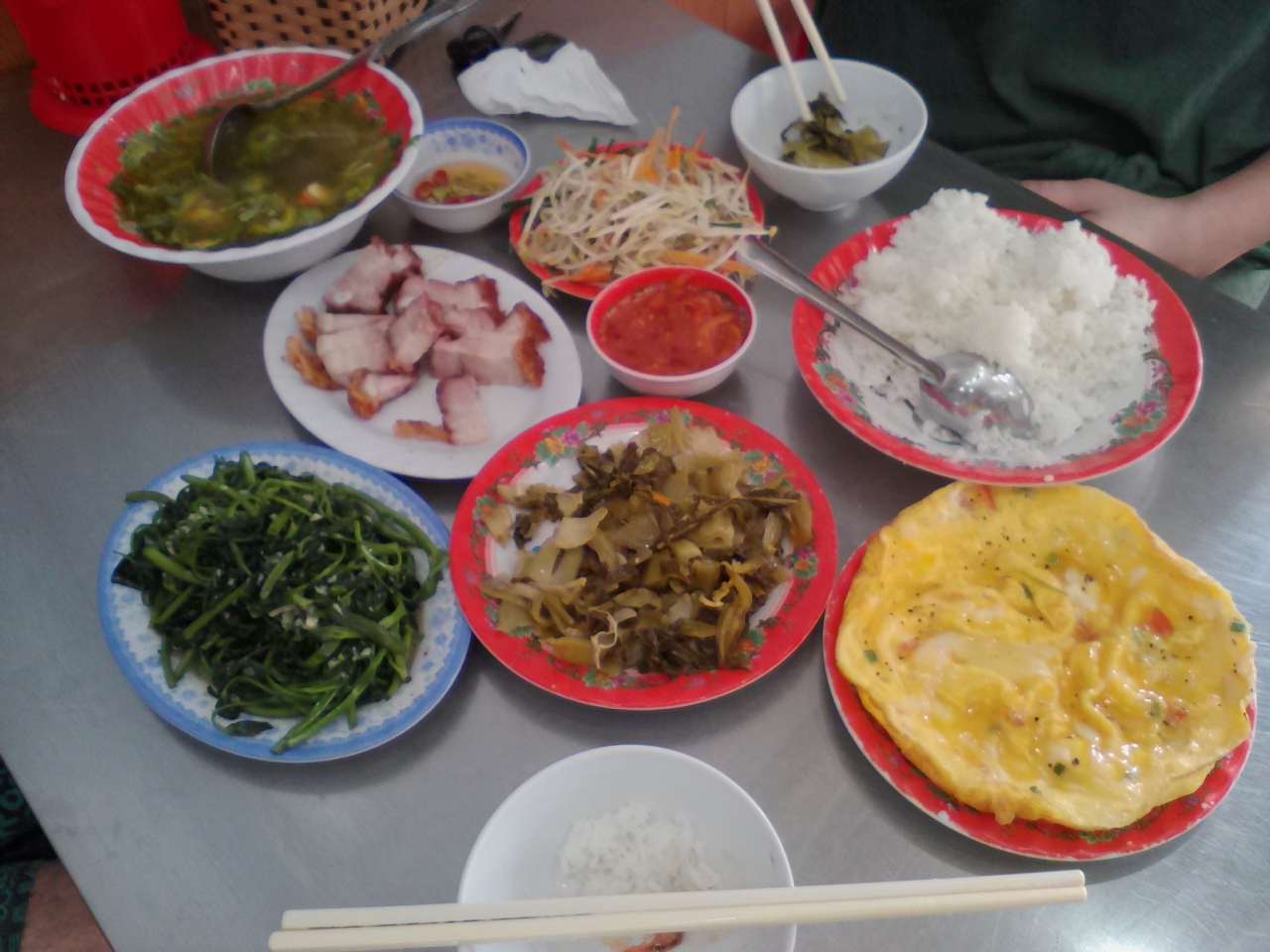 豚肉、空芯菜炒め、卵焼き、高菜、苦瓜のスープと豪勢にいただきました(写真参照)。どれもおいしいですが特筆すべきはご飯。私がいつも行く更にローカル食の強い食堂に比べると雲泥の差でおいしいです。これでお会計は1人あたり約5.5万ドン(約250円)でした。