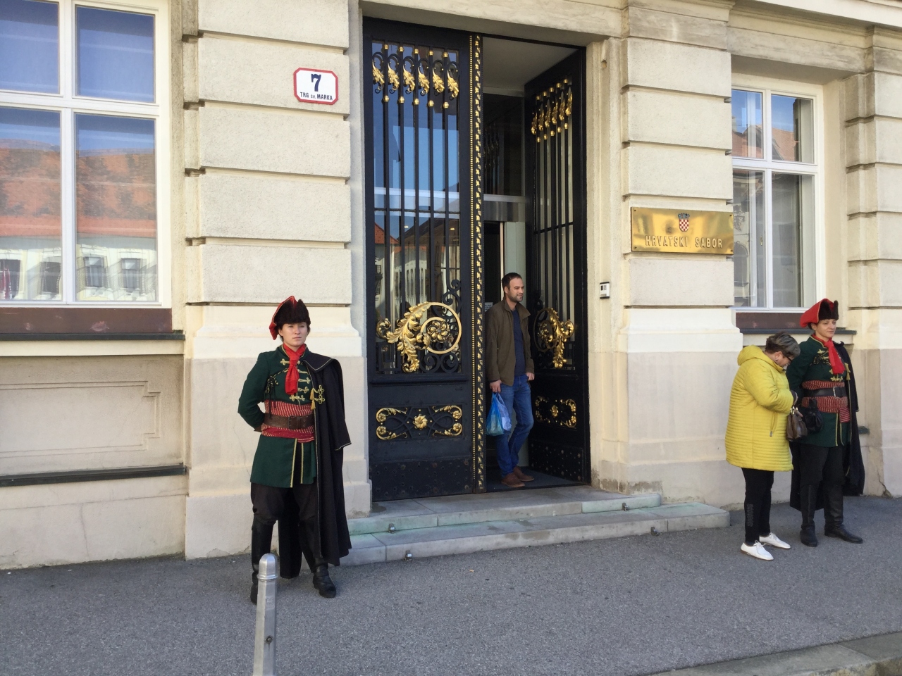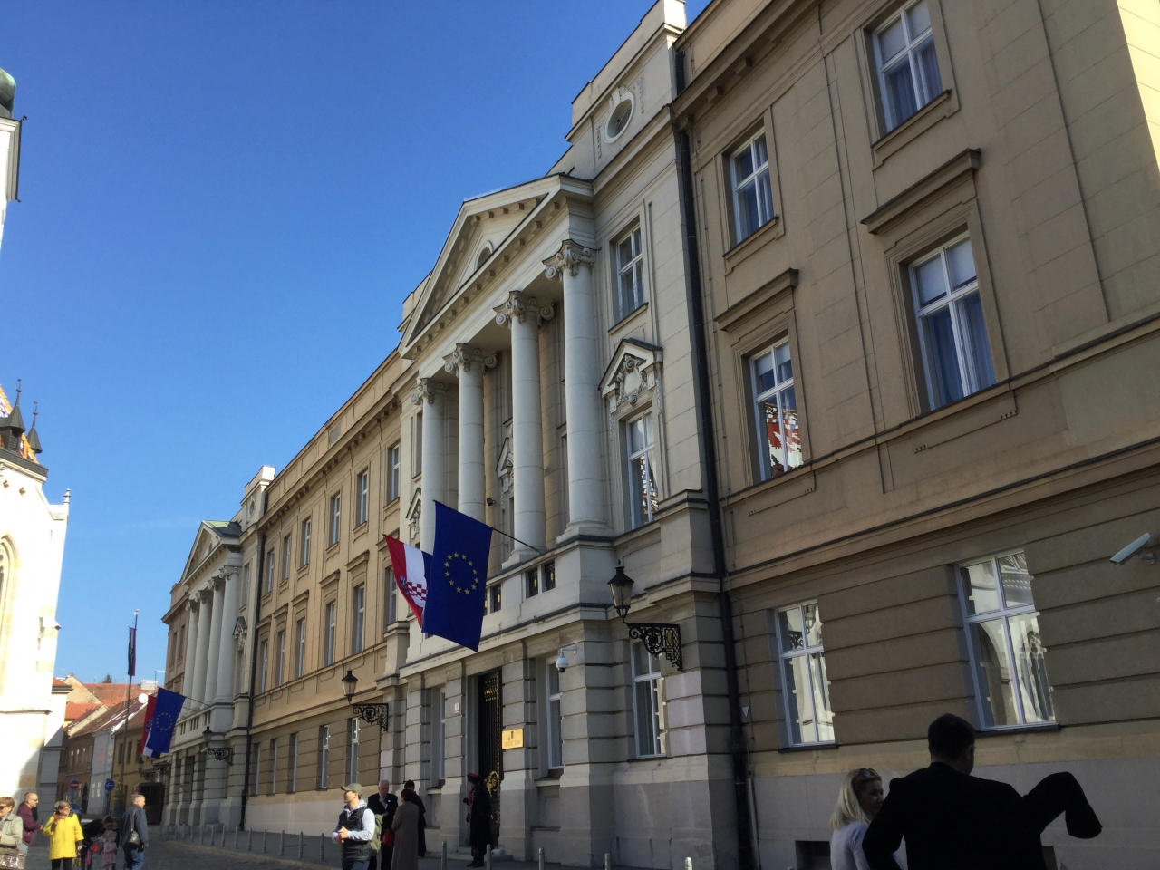 ザグレブ旧市街北側の小高い場所ゴルニィ・グラード地区の聖マルコ教会のお隣にある国会議事堂、日本やロンドンのような目立つ建物ではないので
