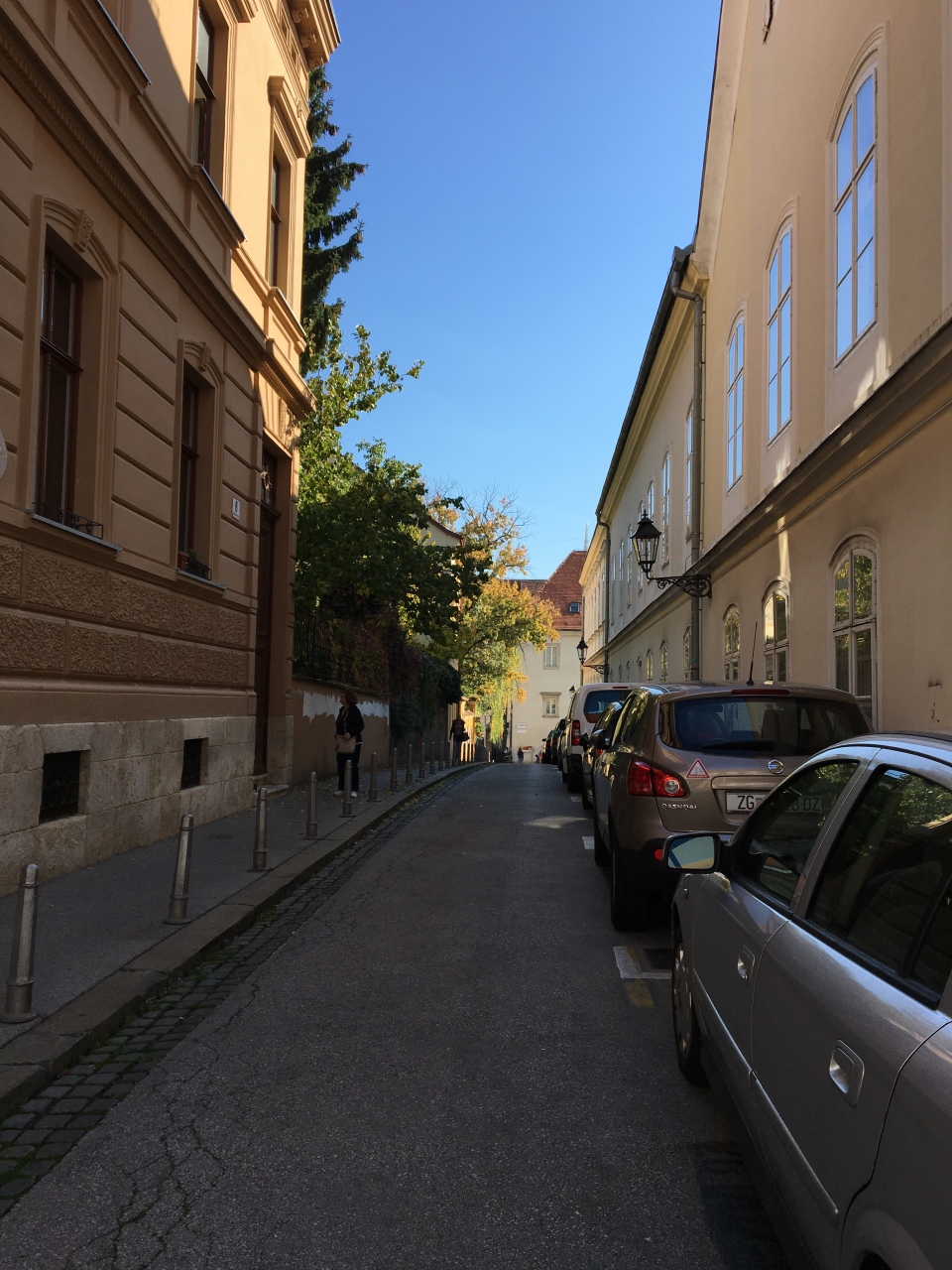 ザグレブ旧市街の北側ゴルニィ・グラード地区の聖マルコ教会に向かって