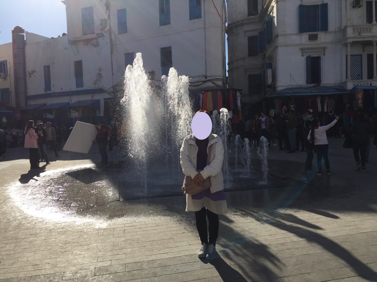 旧市街メディナの出入り口に有り、小さい広場ですが地面から噴水が出ているので良く目立ち、待ち合わせ場所に良いです、すぐ脇にヨーロッパスタイルのカフェや可愛らしい外観のホテルが有ります、端の方にベンチもあり沢山の人が休憩していました、お掃除の人もいてゴミも落ちていません。