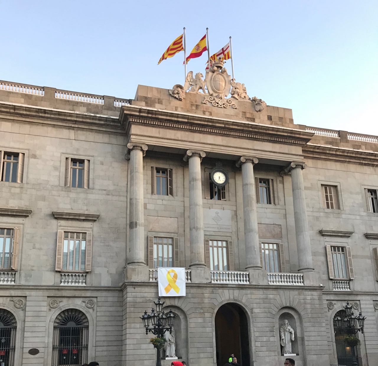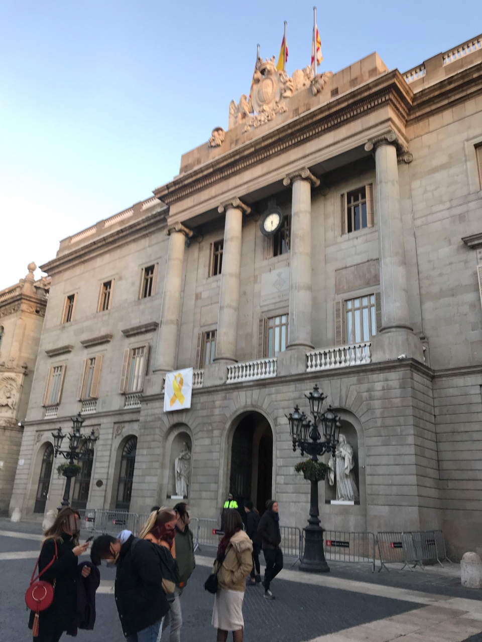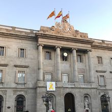 サン・ジャウマ広場に自治統領館と向かい合うように建っています。市庁舎は南側です。いずれも屋上にはスペイン国旗が掲げられていて、政府機関であることがわかります。なお、掲げられている旗は、市庁舎は3本、自治統領館は2本と違いがあり、両者を見分ける方法としても良いかと思います。市庁舎の旗は、左からカタルーニャ州旗、スペイン国旗、バルセロナ市旗だそうです。