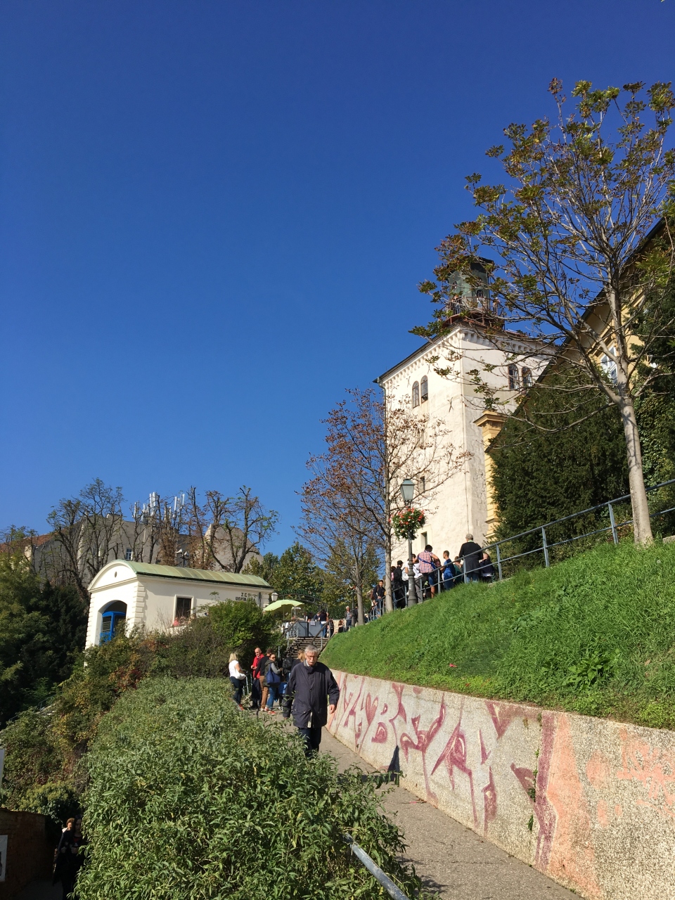見張りのための塔だそうで、この地区は、聖マルコ教会や現在では政府機関が置かれた高台の地区なので、いかにこの塔が昔から重要な見張り塔だったかわかります。世界最短の公共機関ザグレブケーブルカーで登ってくると目の前に出てきます。