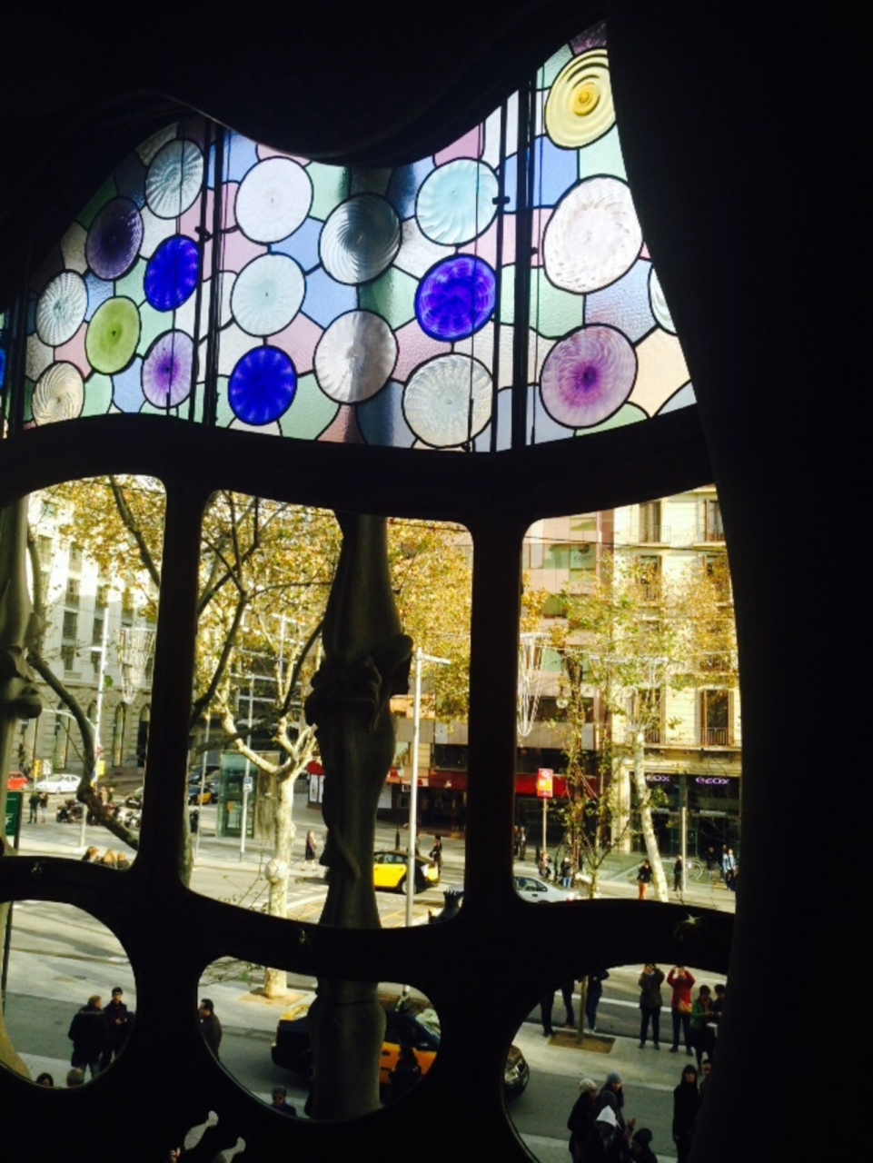 吹き抜けのブルーのタイルの美しさや、バルコニーの曲線とスタンドガラスの色使い、中庭側の装飾、贅を尽くした豪邸は一見の価値ありです。