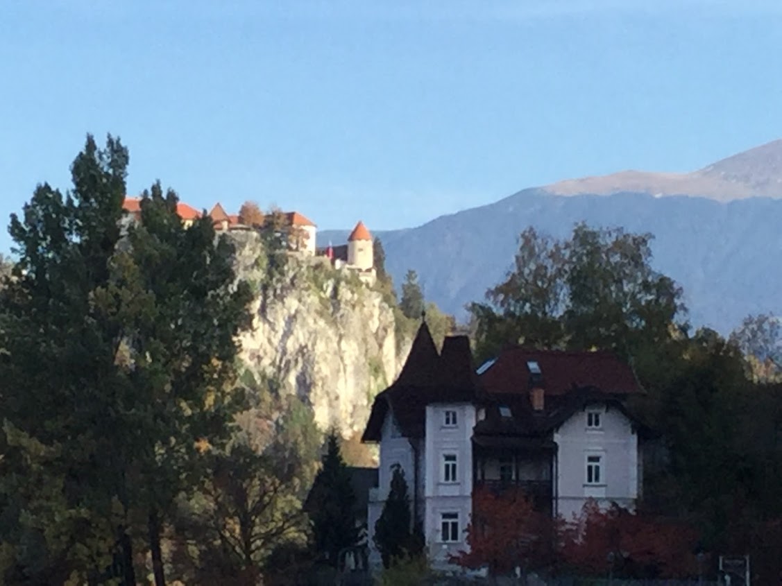 崖の上に建つお城で、背景にはユリアンアルプスの山並み、前面にはブレッド湖と