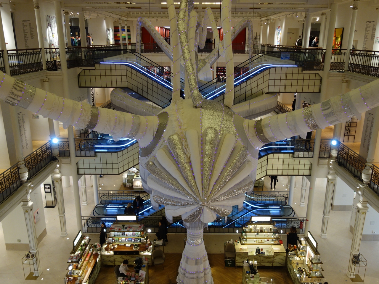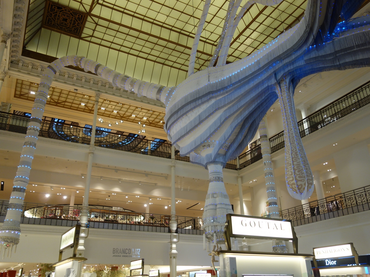 建物内部中央の吹き抜けとそこを飾るオブジェが特徴的。大きなデパートです。