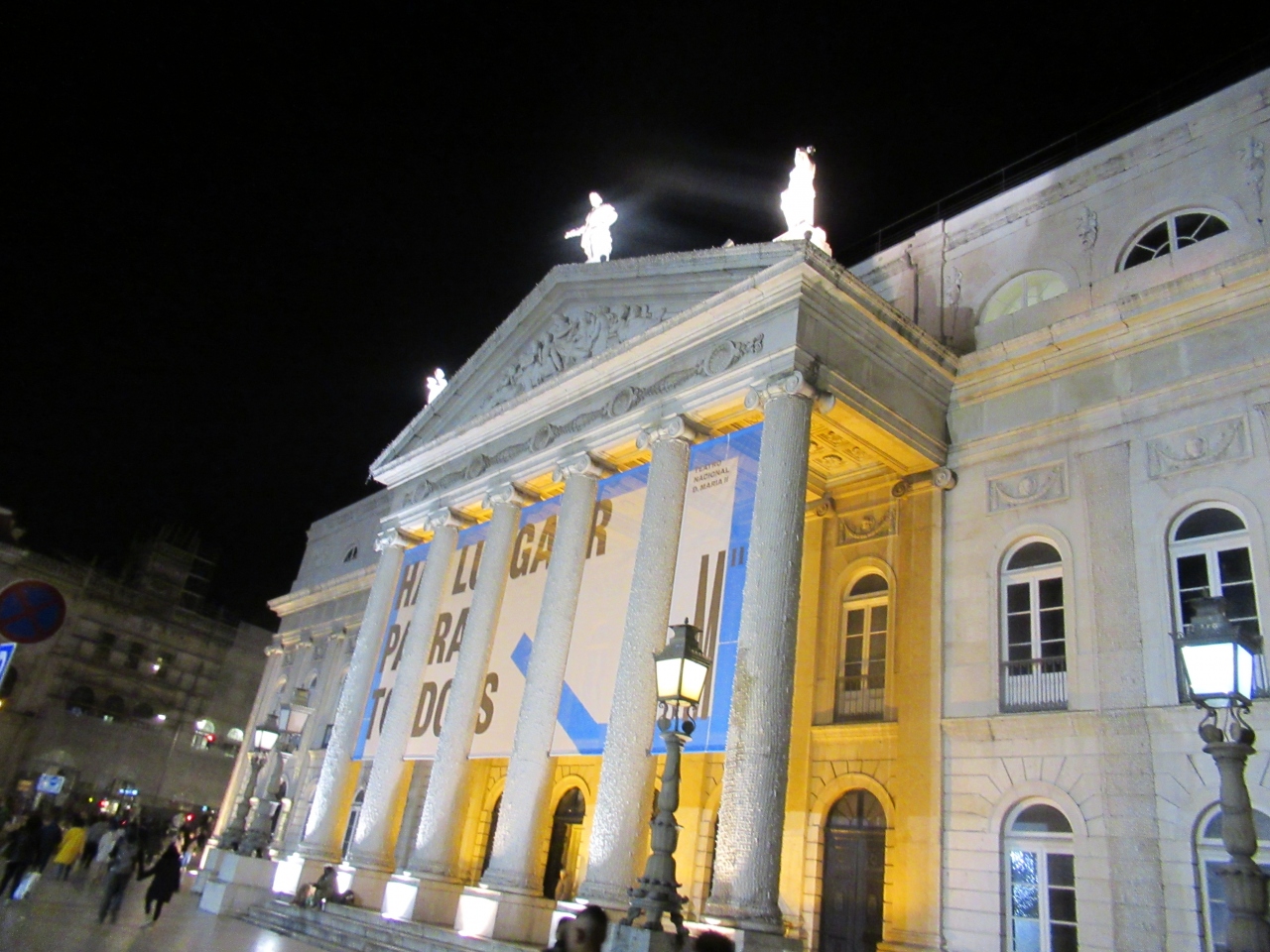 夜に行ってみると、ドナマリア2世国立劇場がライトアップされていて、有名な缶詰屋さんがピカピカ光っていた。