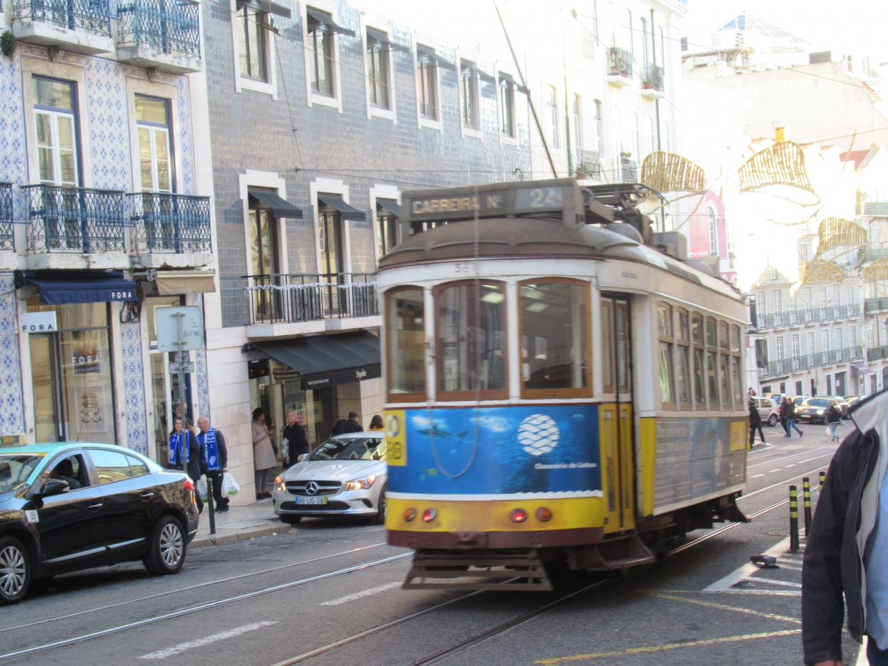 サンペドロデカルカンタラ展望台のもっと坂を上がったところからレトロな路面電車24Eに乗りました。20年以上前に廃止された路線が復活したそうです。カモインス広場 からカンポリデ(エドゥアルド7世公園の西側)間を運行しています。本数は少ないですが28番や12番と違ってガラガラです。路面電車のレトロ感を味わうならこっちのほうがいいと思います。
