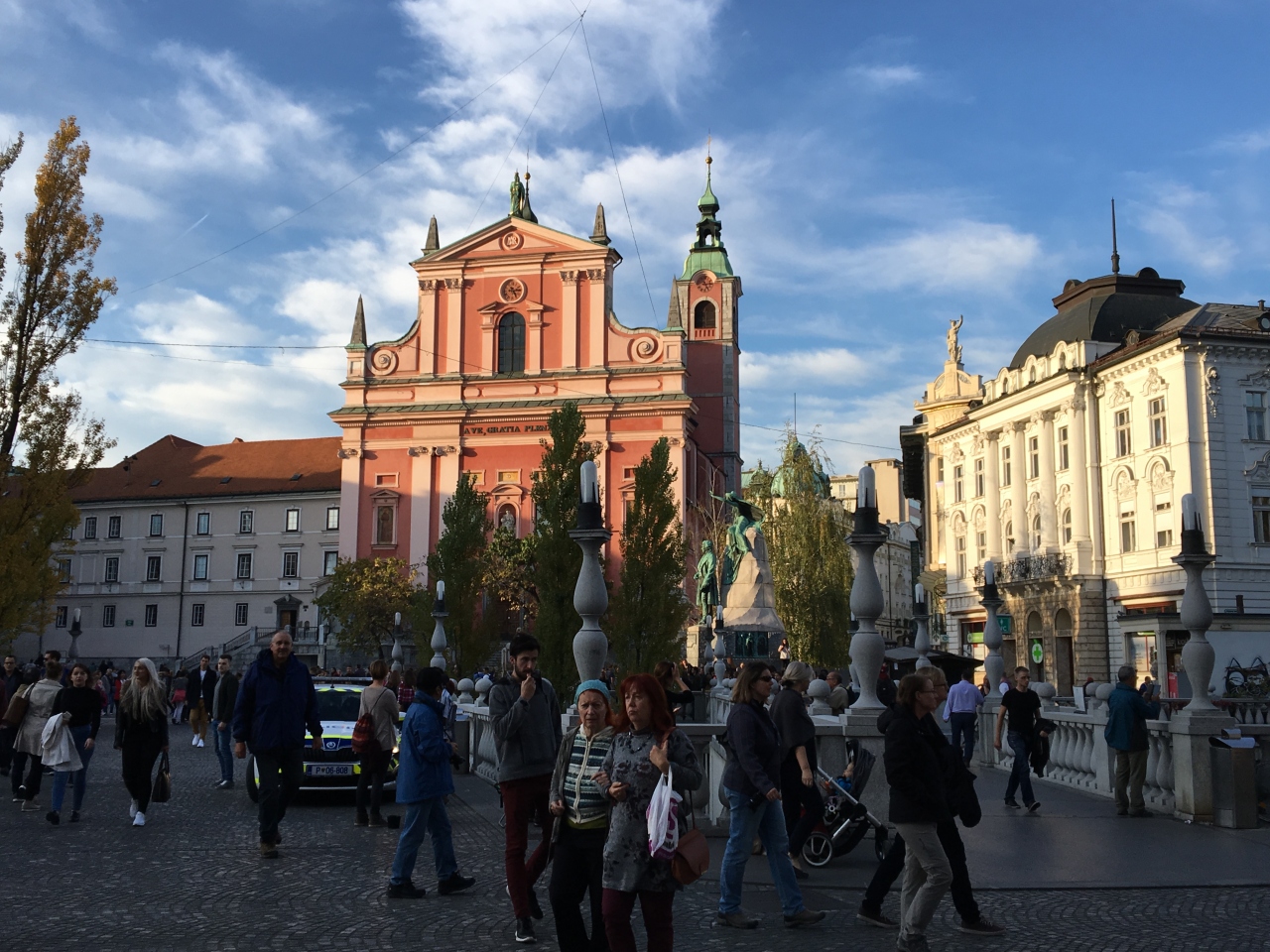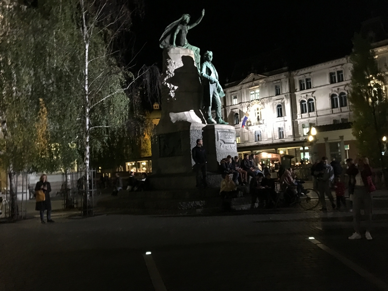 スロベニアの首都、リュブリアナ旧市街の中心地、聖フランシスコ教会と三本橋トロモストヴィエの間にある広場で、19世紀の詩人フランツェ・プレシェーレンのの銅像があります。この広場を目印に効率よく観光が出来ます。銅像の石段では
