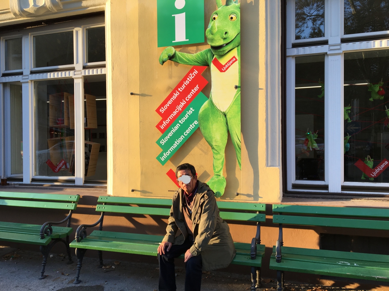 蛙の案内板がかわいい観光案内所、オブジェにはリュブリアナの文字が入っているし