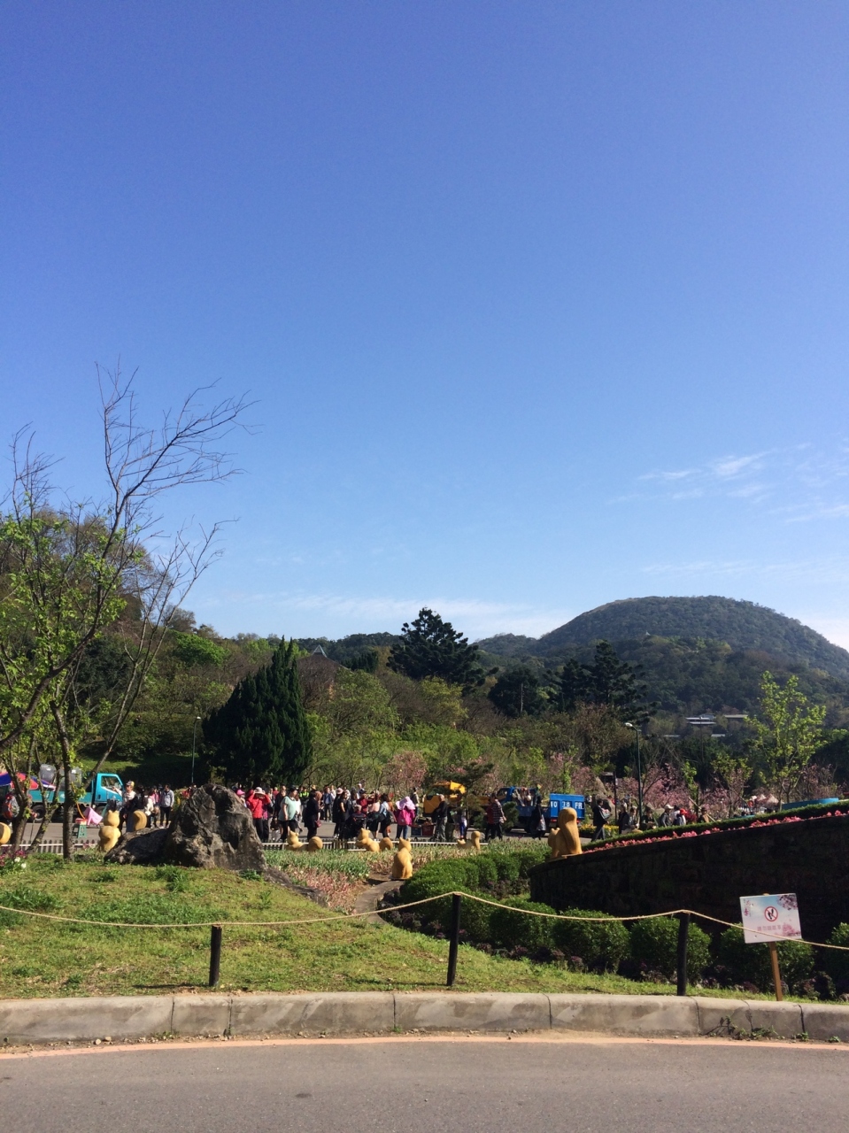 3月に陽明山公園に行きました。桜の花が咲いていて、駐車場もすべて有料になっていました。とても、人が多くて、桜の花に群がって写真を撮っていました。桜の種類は日本と違って、赤い桜で、花は下を向いているタイプでした。
