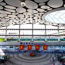 今まで地上を走っていた台湾鉄道が地下に走ることになり、地下鉄と乗り換えのできる新しい駅舎に変わりました。駅をデザインしたのはオランダの設計会社MECCANOによるもの。不揃いの円がたくさん集まる天井のデザインが特徴的。今後駅周辺の再開発も進み、新しく建つ周辺のビル群も丸みのあるデザインで統一されてる予定。